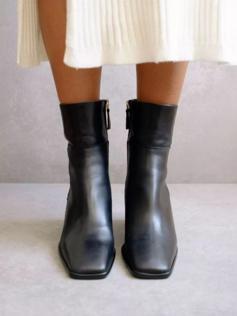 Based in Barcelona, ALOHAS is all about sustainable footwear with a fresh look. Made of luxe leather, these versatile ankle boots have square toes and sculptural block heels.