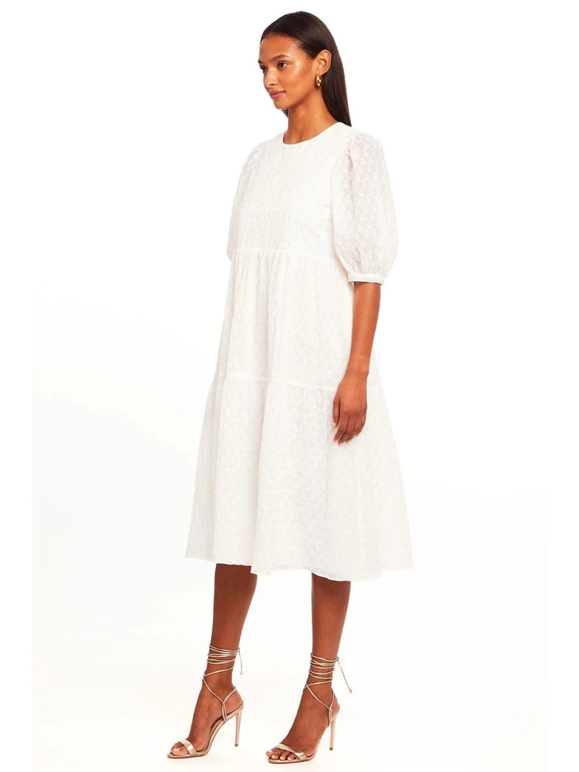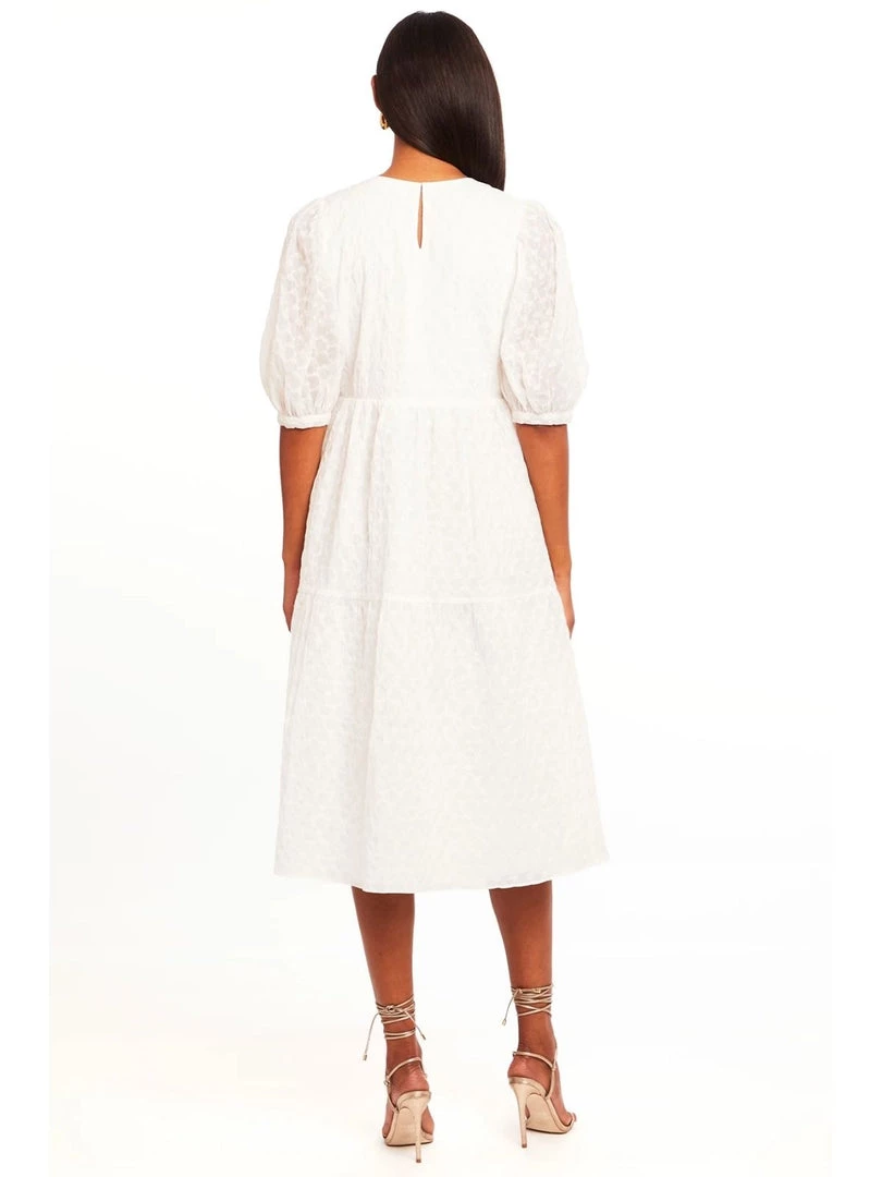 Feel super chic and feminine in our Hilaria Dress. With puffed sleeves and a tiered hemline, this dress is the ultimate summer fit for all of your white dress events. Pair with sneakers or sandals for a casual look, or dress it up with gold accessories and strappy heels for the evening.