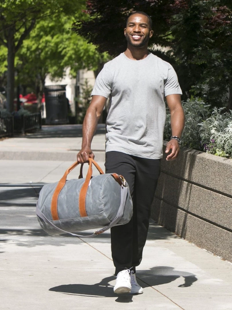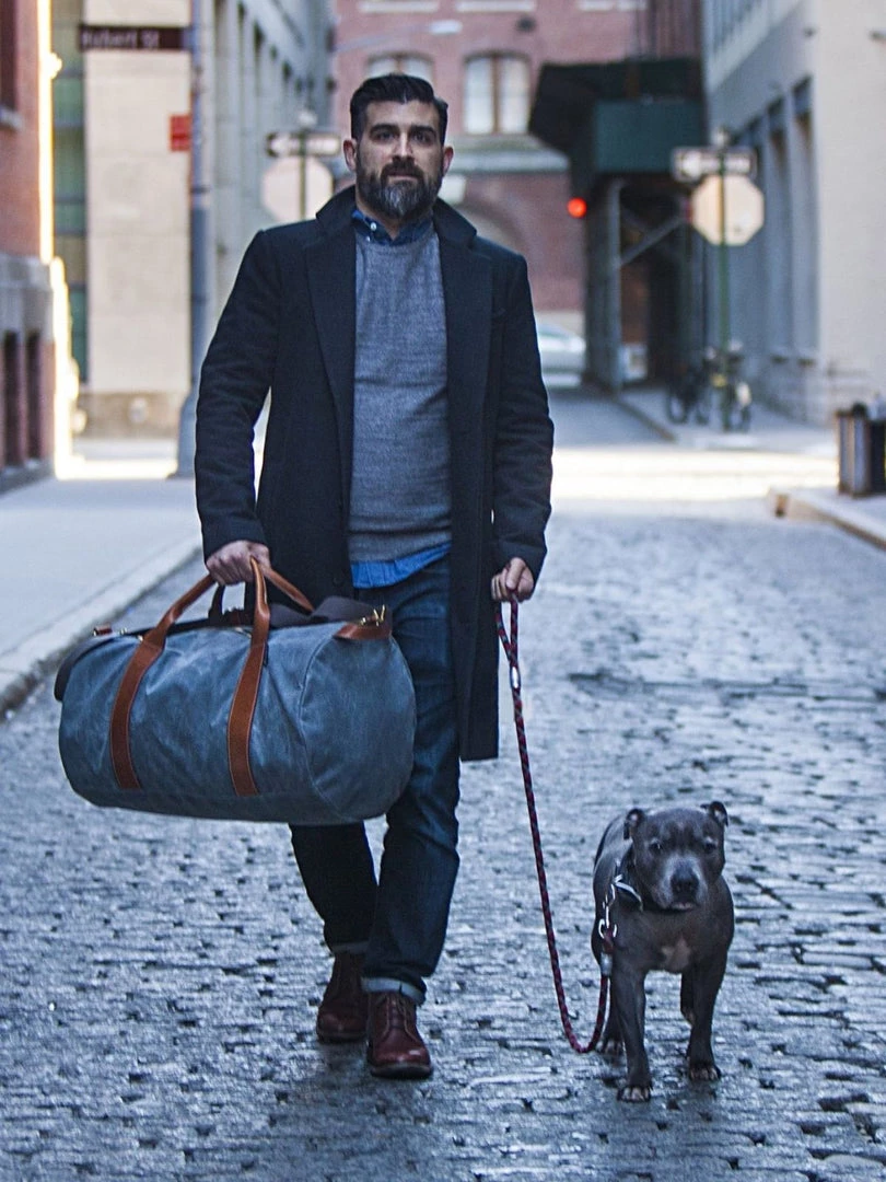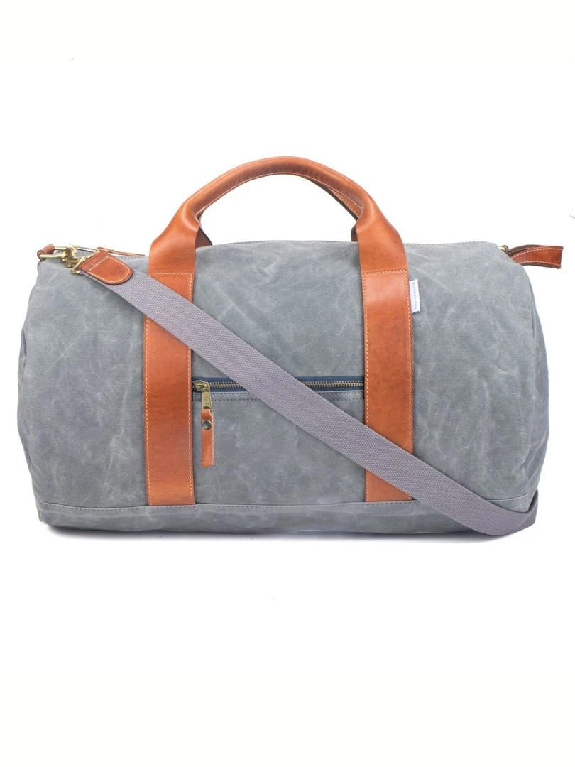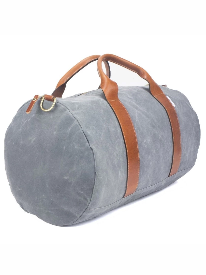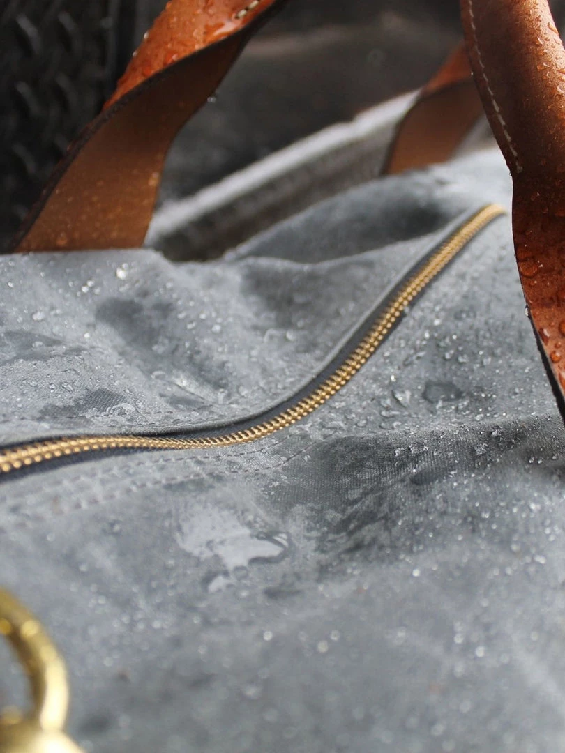 Crafted with waterproof and re-waxable waxed canvas in charcoal, with a navy cotton twill interior.