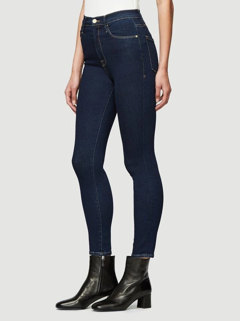 Ultra High Rise Skinny Jean With A Shorter Inseam. Crafted From Super Stretch Premium Denim In A Dark Indigo Wash.
