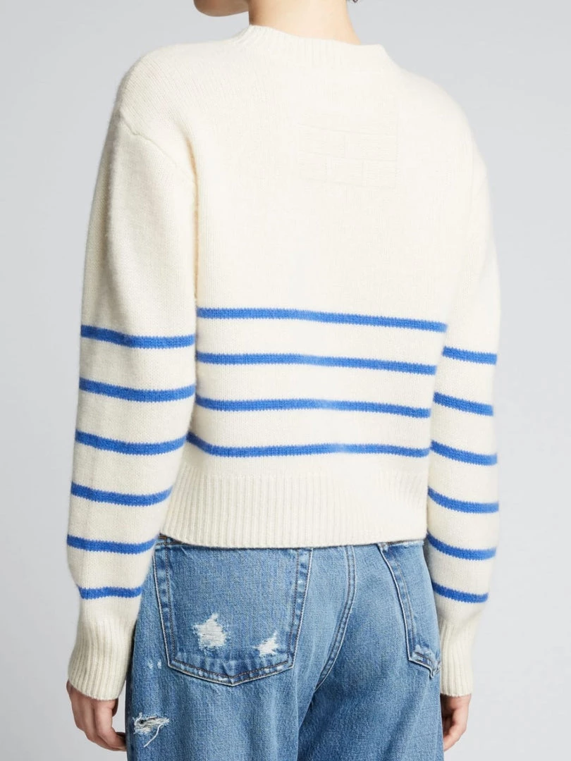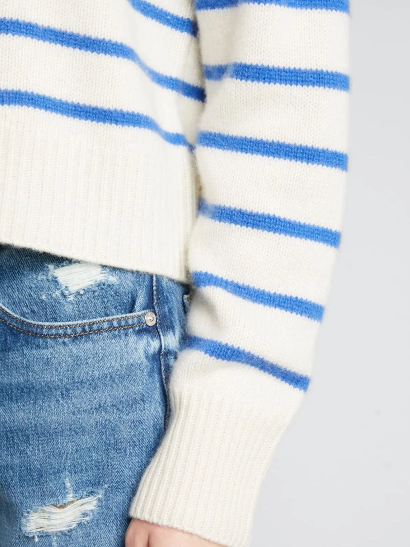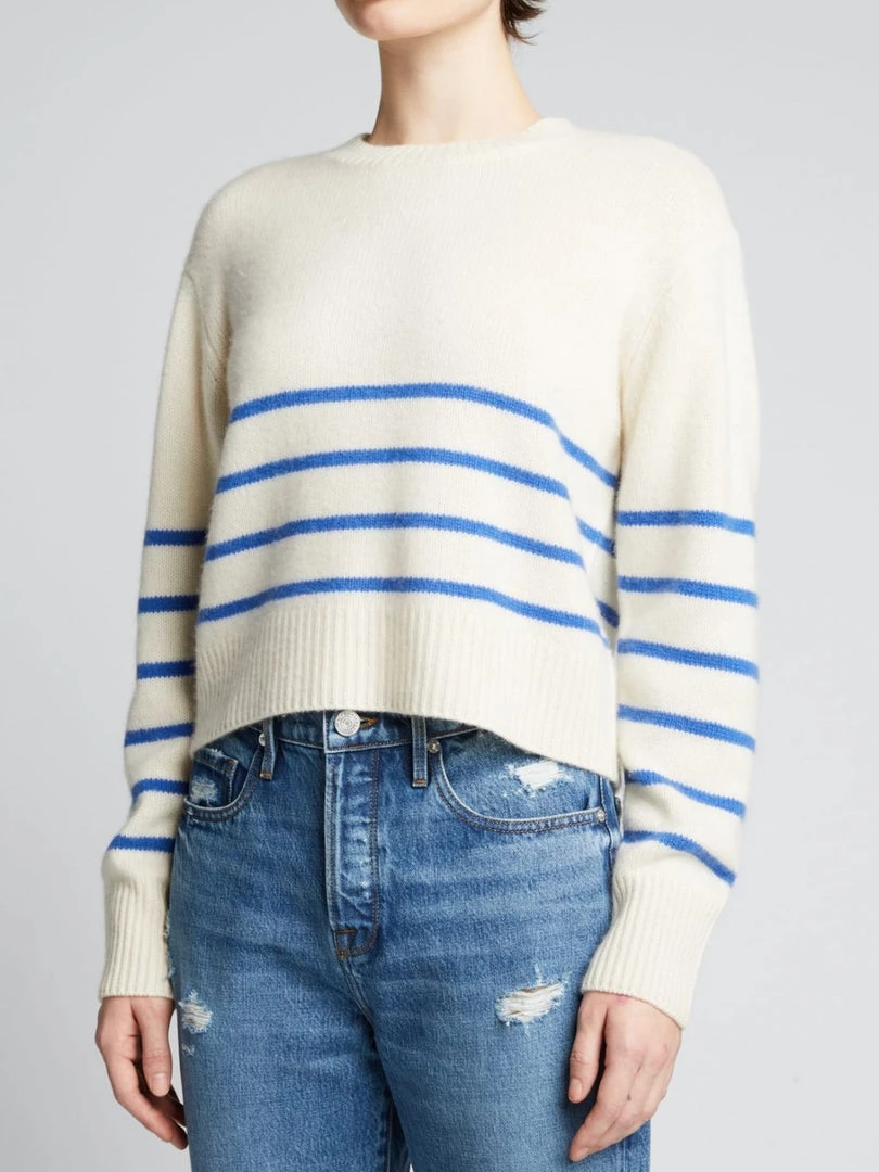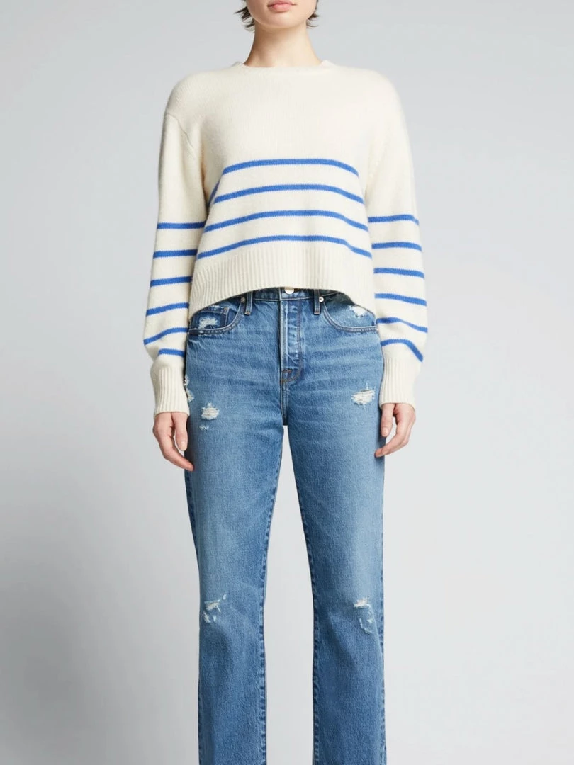 Classic lines and elevated construction, all knit in luxuriously soft 100% traceable sustainable cashmere. This striped crewneck is a summer staple with a modern fit—the bottom hem is slightly cropped to hit at the natural waist—and features ribbed cuffs and hem, plus the FRAME plaque on the back.