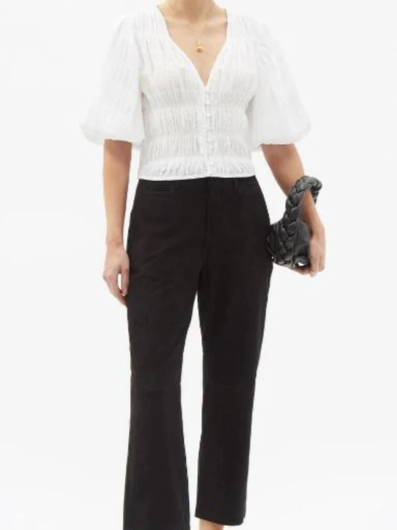 FRAME channels a nostalgic sensibility with the bohemian silhouette of this white Julianne top. Rendered from ruched cotton-blend voile, it’s centred by an alluring V-neckline balanced by puffed sleeves and buttons through the front before ending in a playful cropped hem.