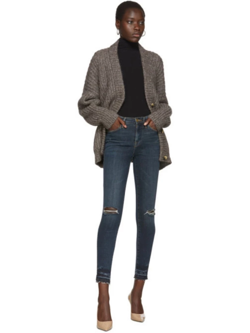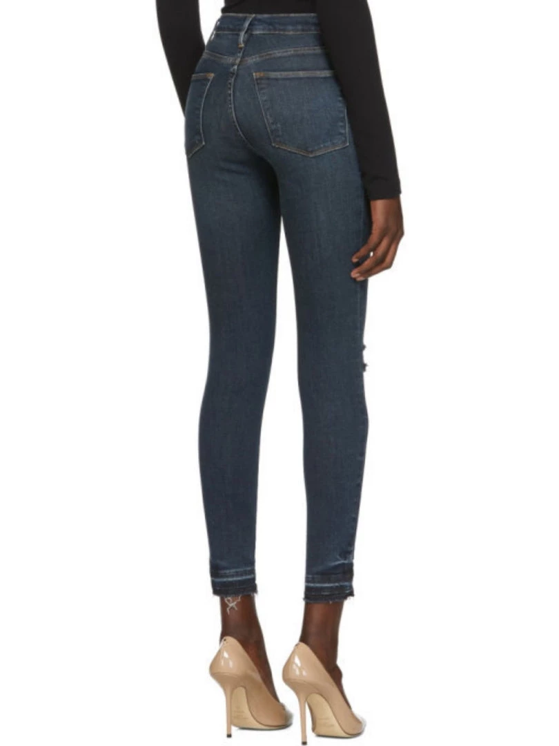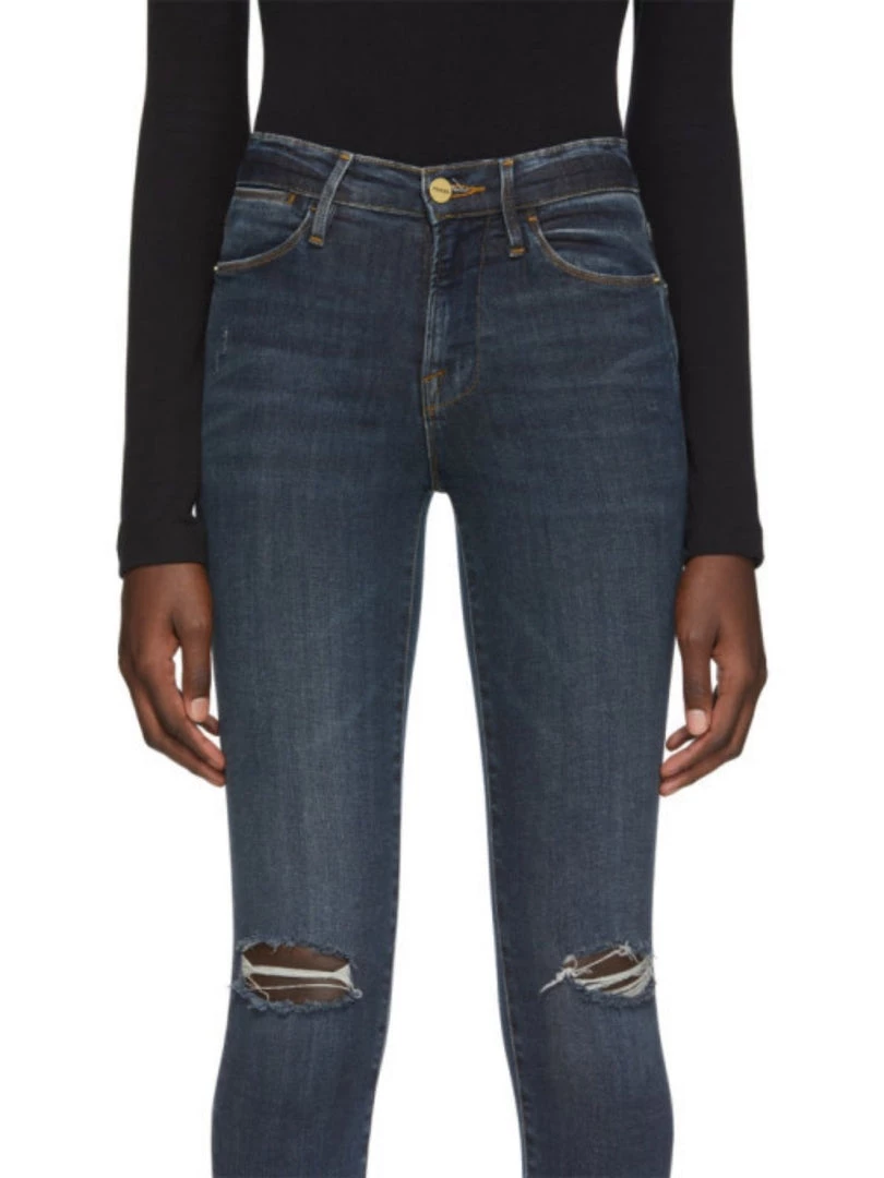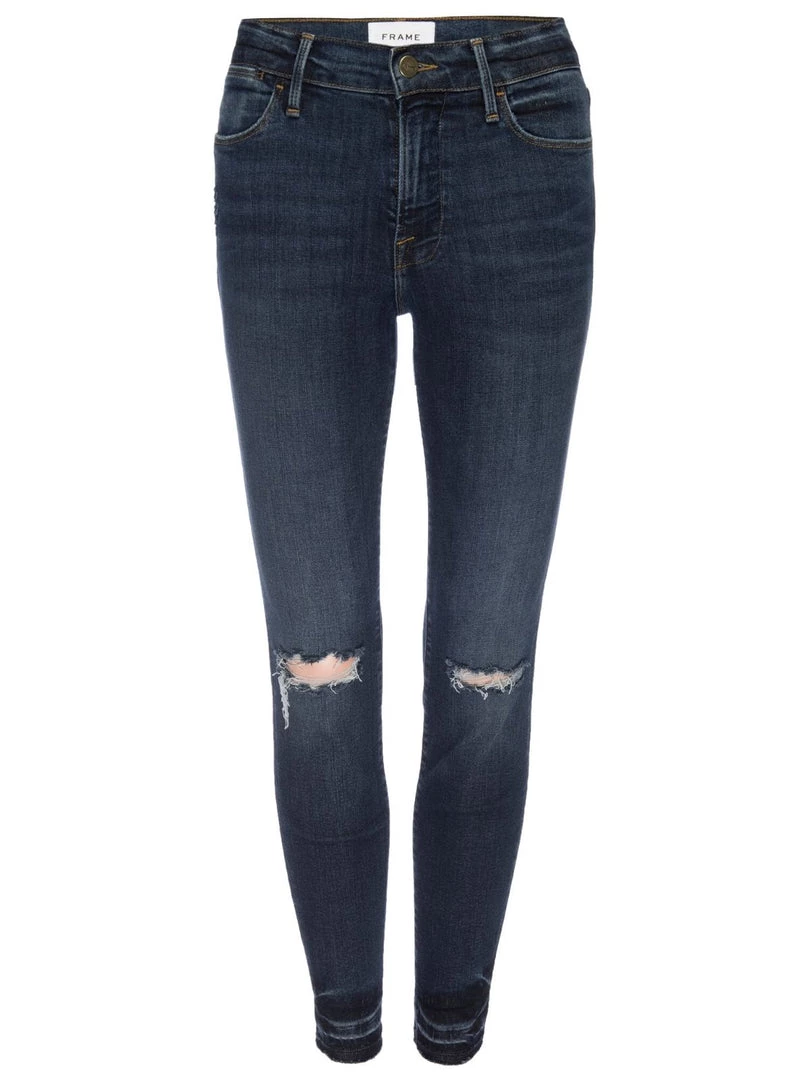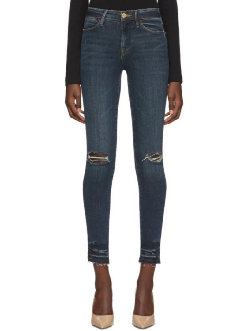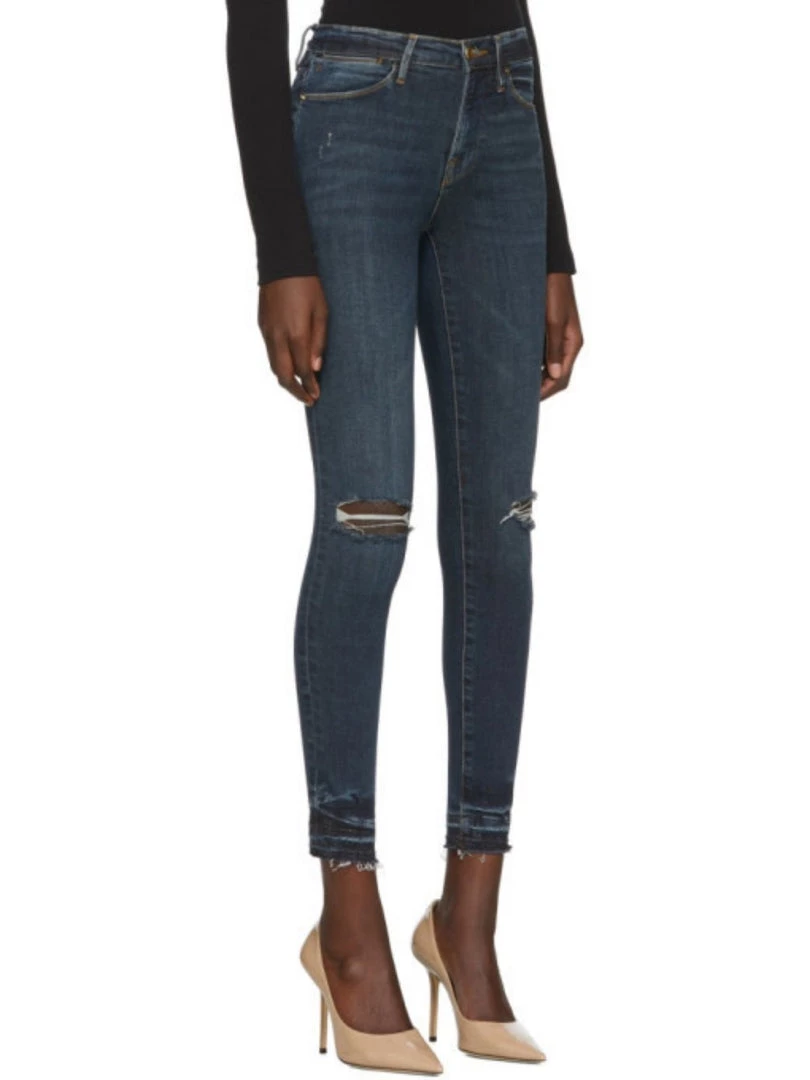 Classic 70s Inspired High-Rise with a contemporary skinny silhouette. Crafted from Premium Denim in a dark blue wash with rips on the knees. This pair has raw hems on the edges with a detailed wash above the raw hem. With Super Stretch and Strong Recovery.