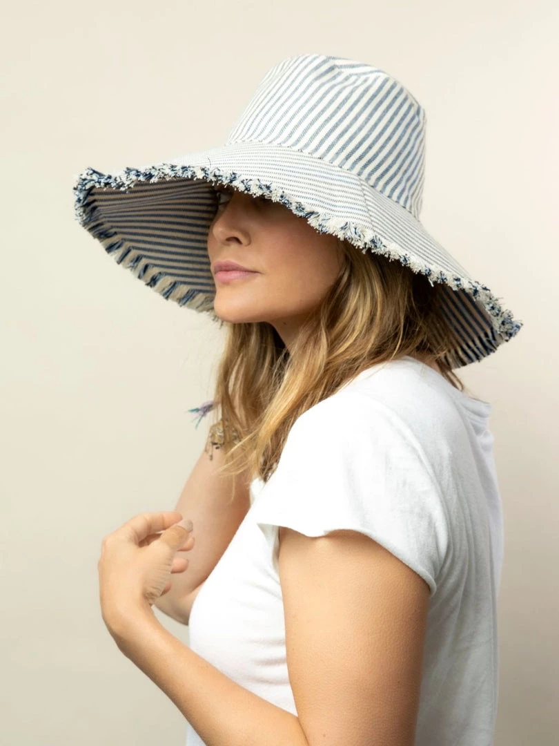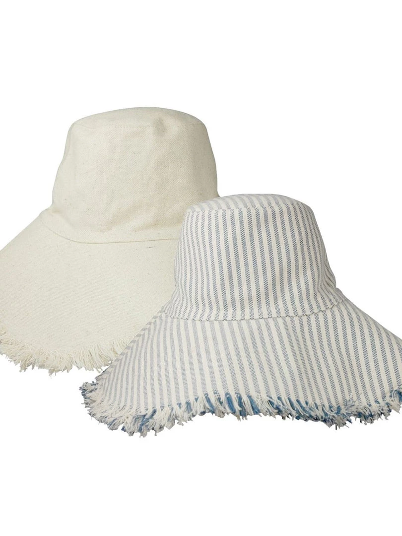 Our canvas hat is both classic and trendy. It has built in SPF protection and easily packable in your luggage! Keep in simple with solid natural and white or choose from our three stripe options: ocean, black and natural.