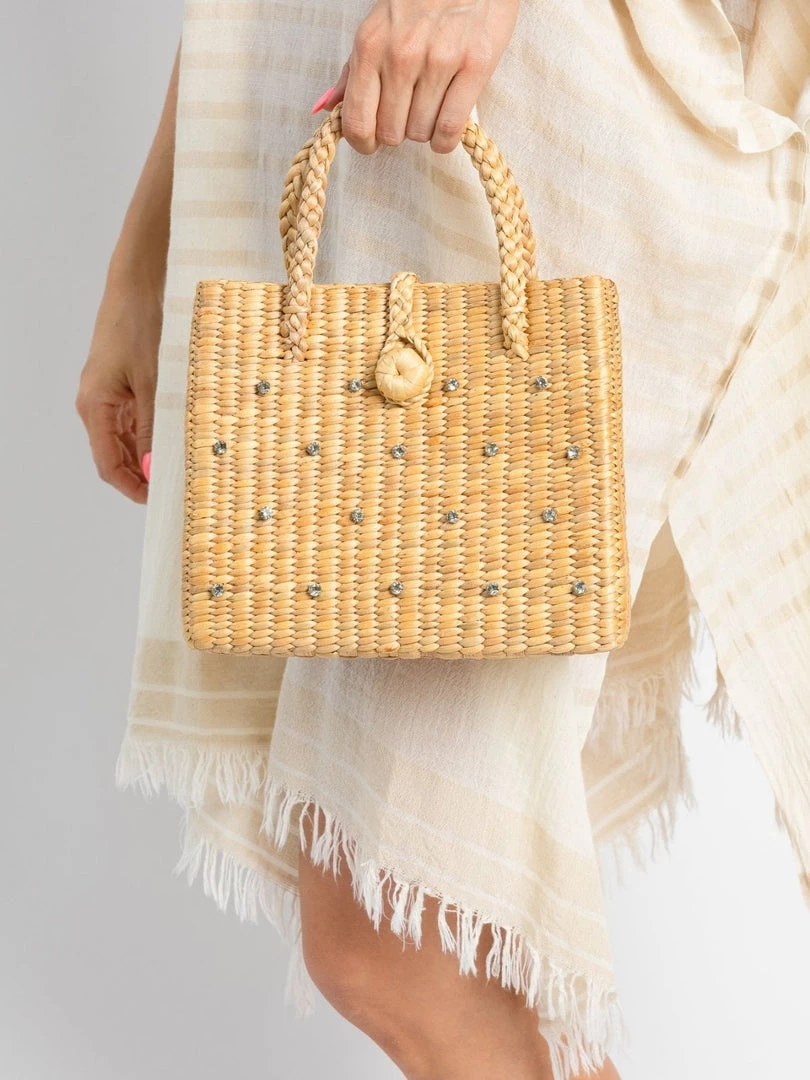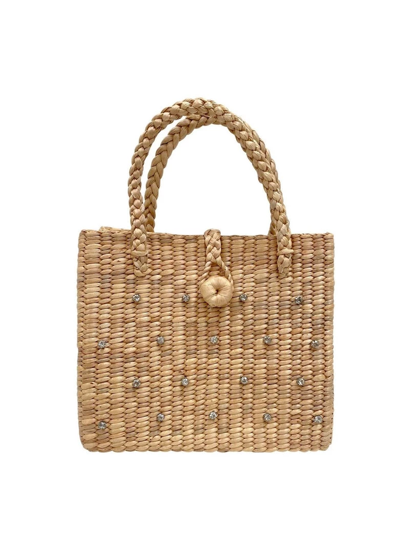 Natural color summer bag with a loop closure. The cutest bag with crystal details for summertime fun!