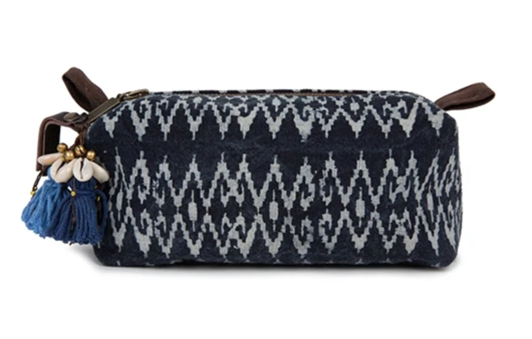 Batik cosmetic bag with puka shell tassel and nylon lining.