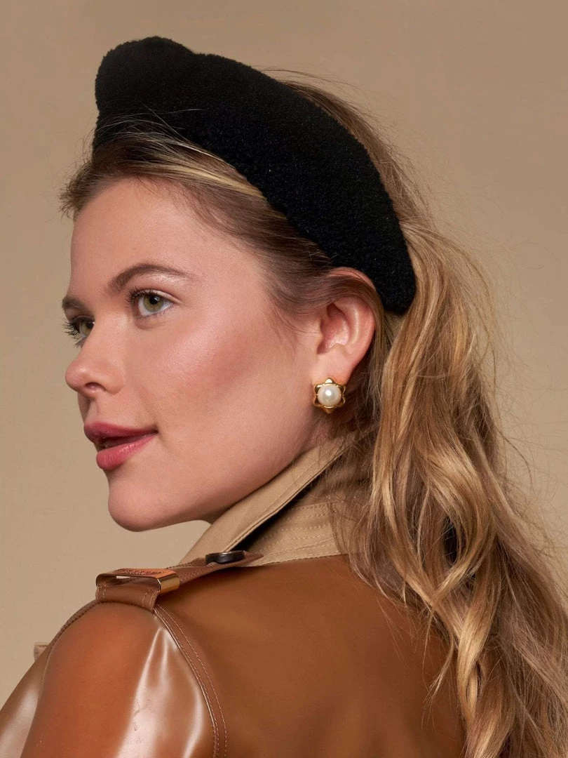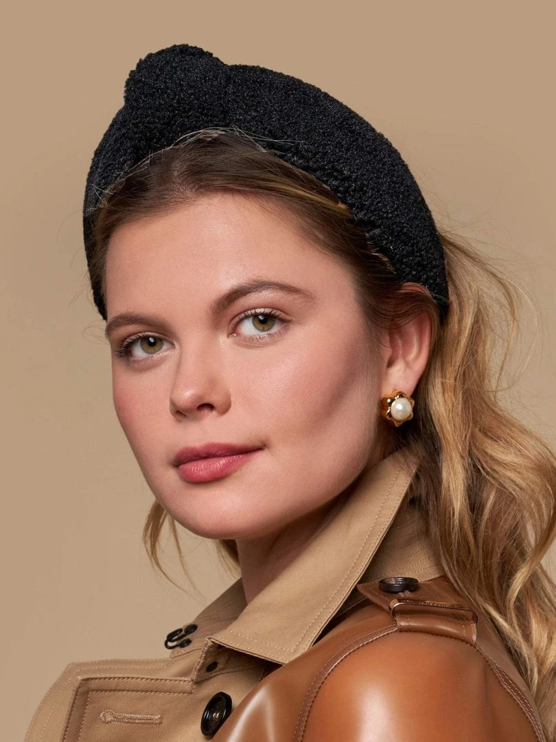 Soft faux shearling teddy hand knotted over our 1″ width comfort fit headband. 1 1/2″ knot and 2 1/2″ side width for a luxurious, wider coverage. One size only.