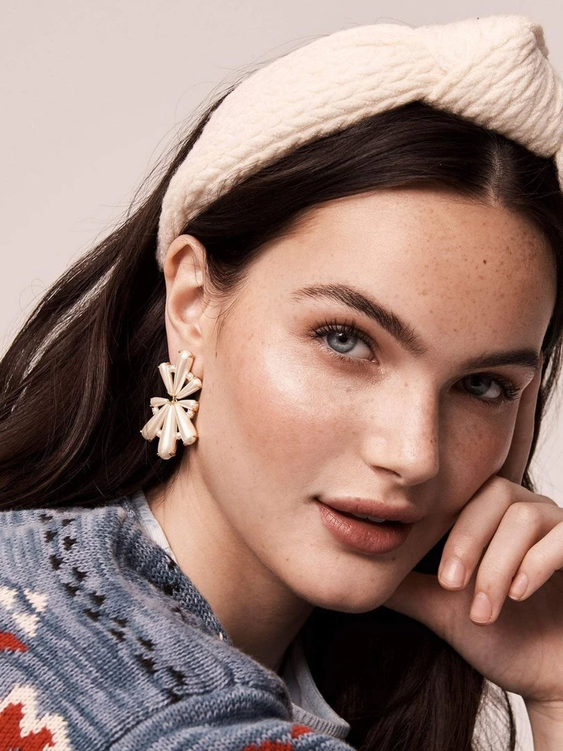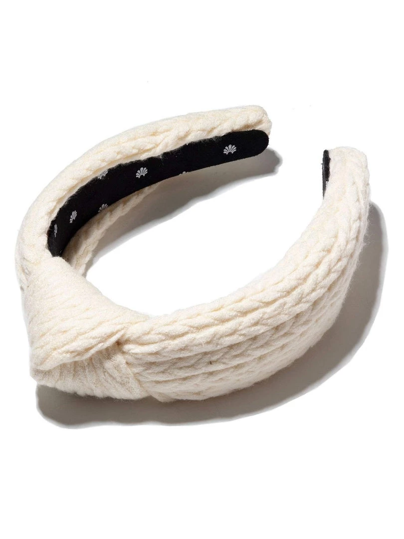 Ivory cable knit poly blend yarn hand-knotted over our 1″ width comfort fit headband. 1 1/2″ knot and 2 1/2″ side width for a luxurious, wider coverage. One size.