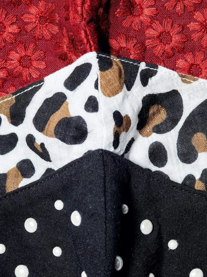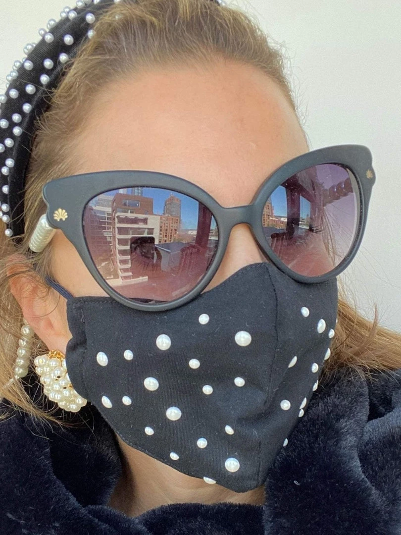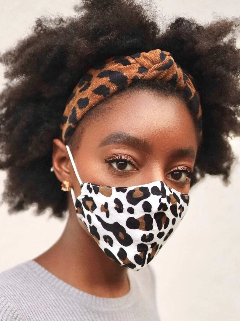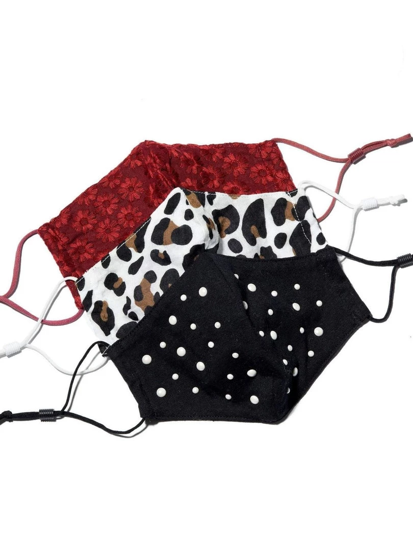 Set of three reusable face masks including a garnet embroidered daisy, soft cotton rayon blend jersey white leopard, soft 100% cotton jersey jet with heat stamped pearls. All feature a contour fit, two-layer design, super soft t-shirt lining, adjustable elastic ear straps, and an opening for a filter pocket (filter not included). Hand wash with warm water or machine wash on cold with lingerie bag. We recommend using our delicate wash bag. Lay flat to dry. Y One size measures 7 1/4″ by 4 3/4″. Imported. Please note, these masks are not substitutes for medical-grade personal protective equipment. At Lele Sadoughi, we have made an initiative to fight Covid-19 by donating thousands of headbands with button hooks to help healthcare providers with comfort when wearing their medical masks. Thank you for your support.