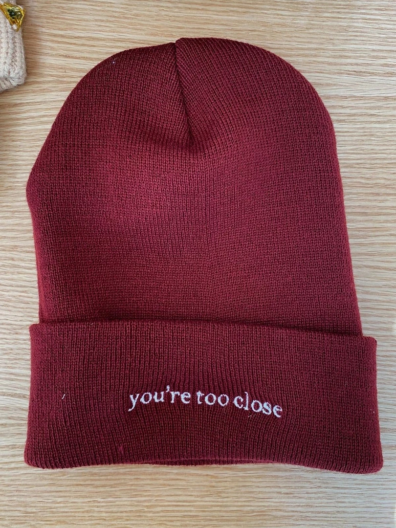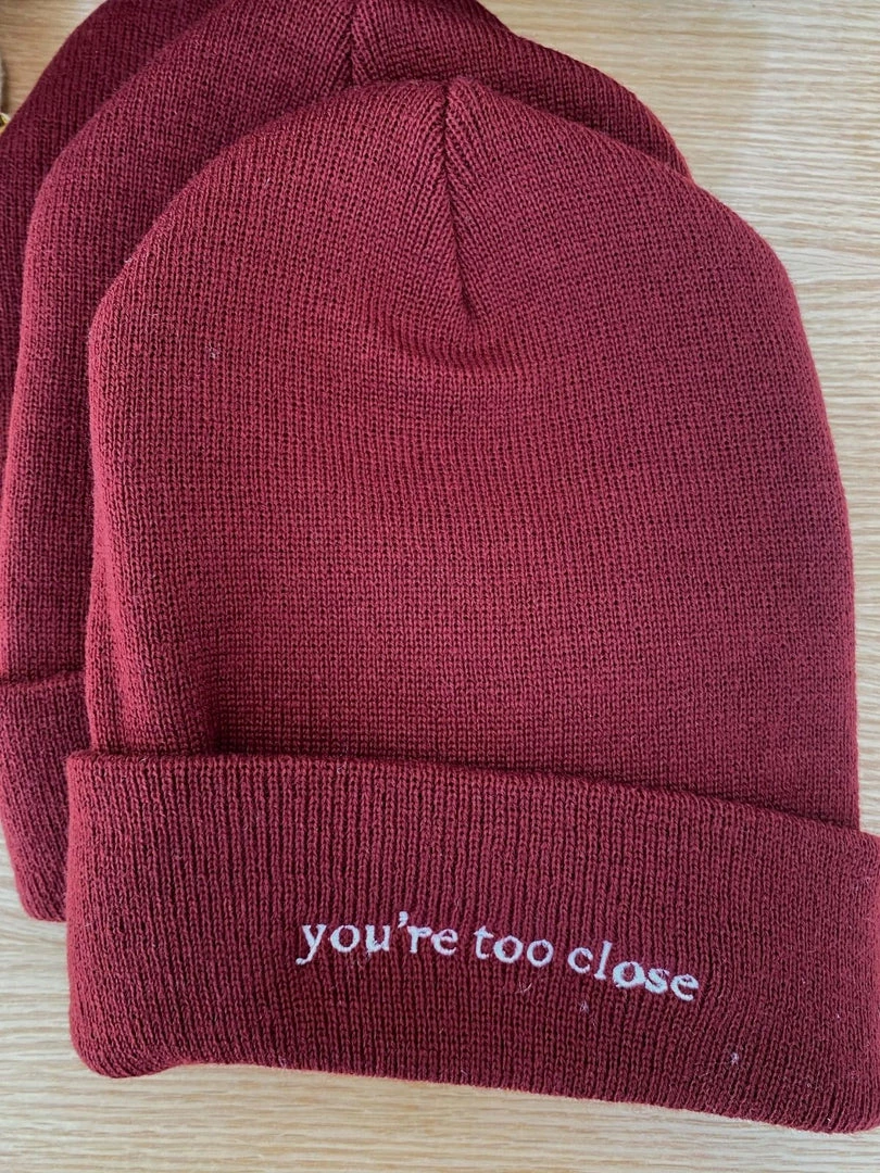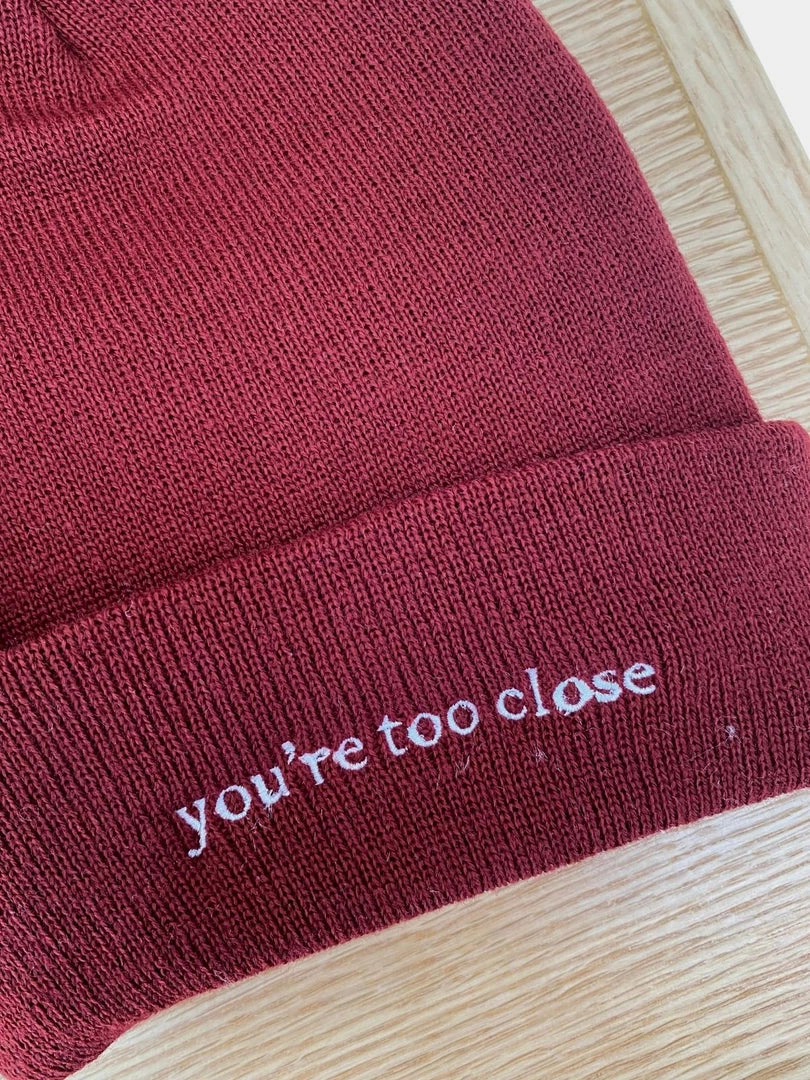 Our comfortable unisex beanie in burgundy. If someone can read this, they’re definitely “too close!”. Makes for the perfect Secret Santa holiday gift or stocking stuffer.Â