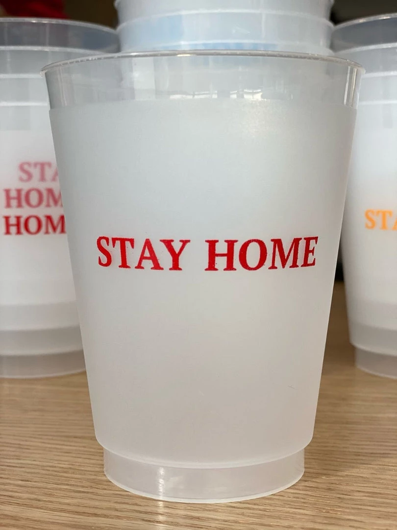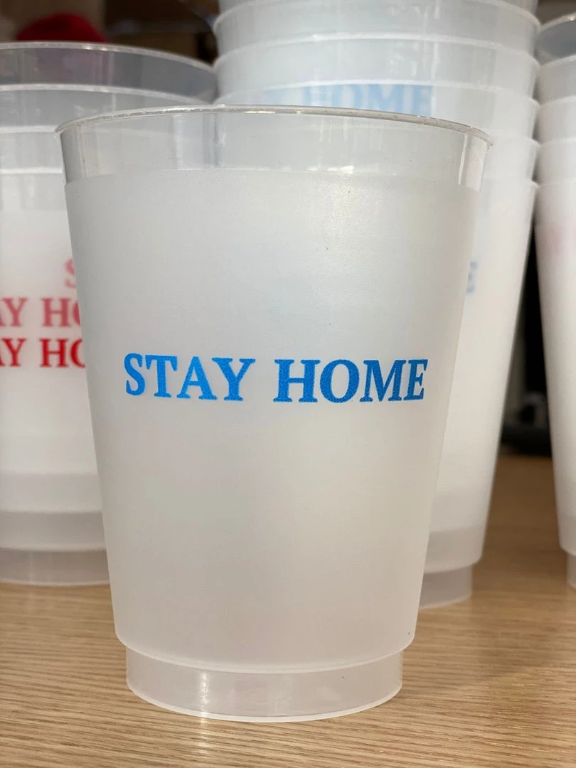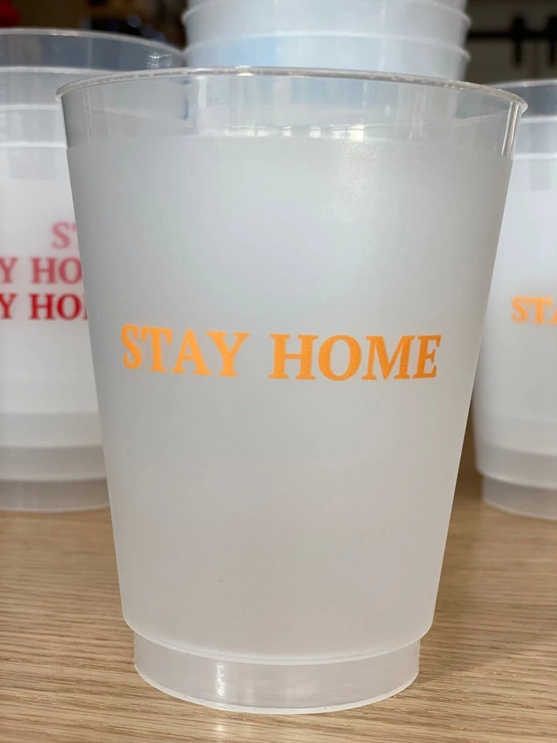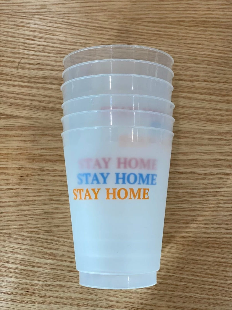 Lovebirds Original pack of 6 frosted cups with a friendly reminder to stay home! Three different vibrant colors: blue, red, and orange with two colors in each pack!