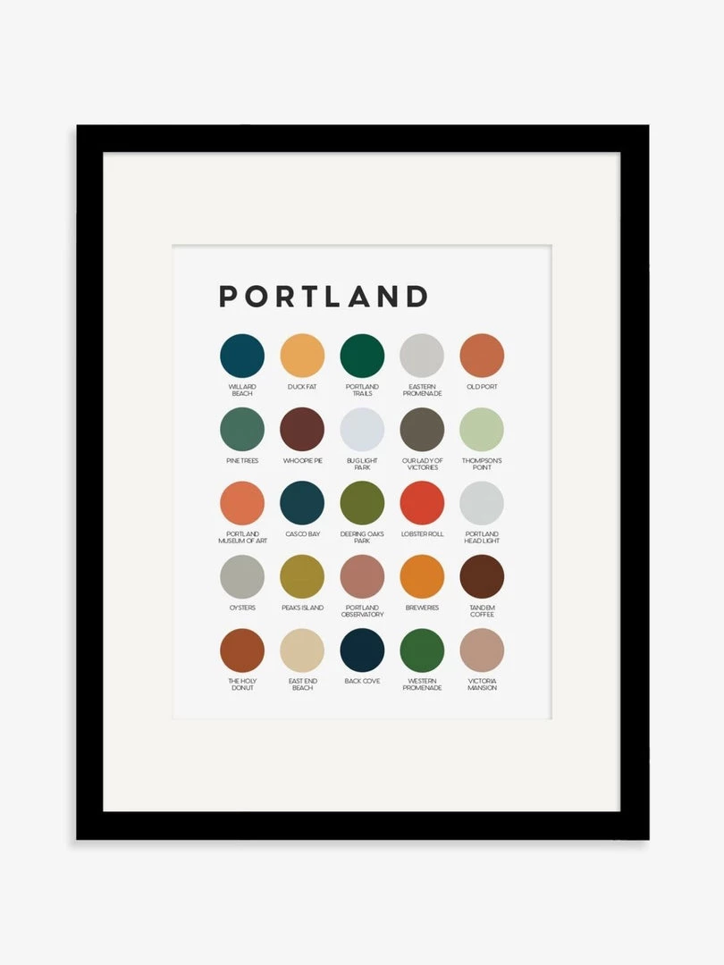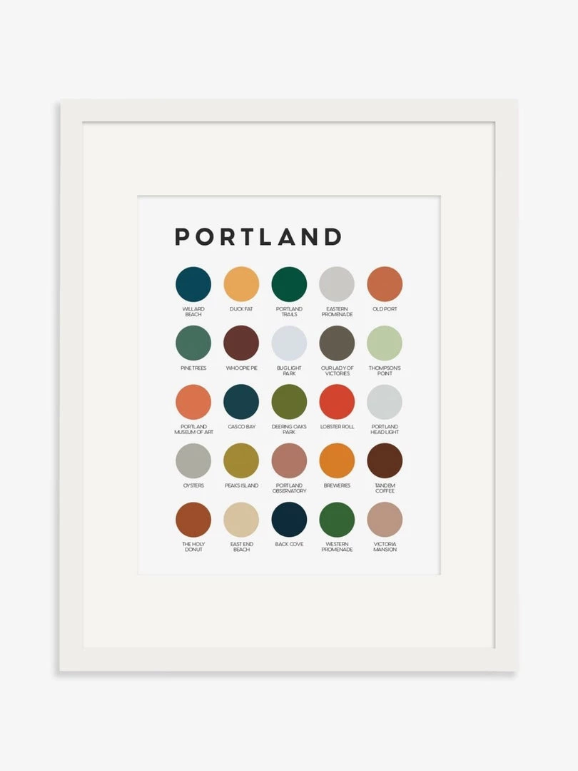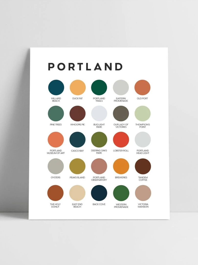A color palette for your favorite Portland, Maine landmarks, attractions, sports, food, and more. This includes Willard Beach, Duck Fat, Portland Trails, Eastern Promenade, Old Port, pine trees, whoopie pie, Bug Light Park, Our Lady of Victories, Thompson’s Point, Portland Museum of Art, Casco Bay, Deering Oaks Park, Lobster Roll, Portland Head Light, Oysters, Peaks Island, Portland Observatory, breweries, Tandem Coffee, The Holy Donut, East End Beach, Back Cove, Western Promenade, and Victoria Mansion.
