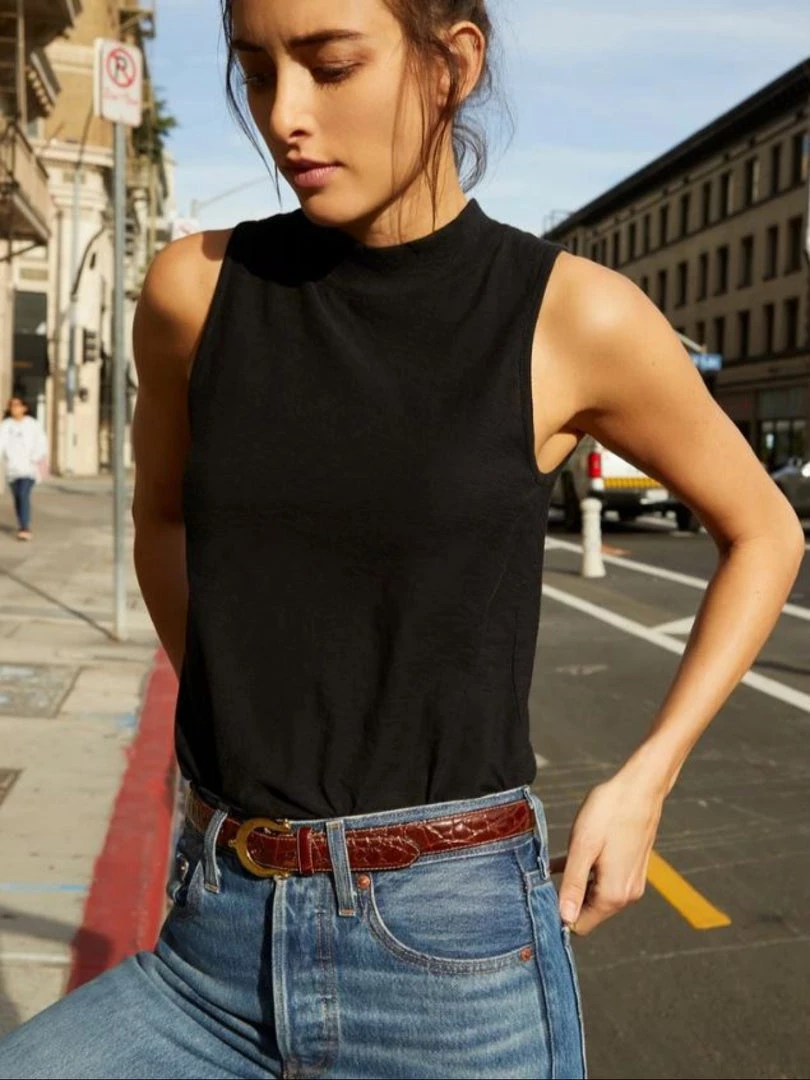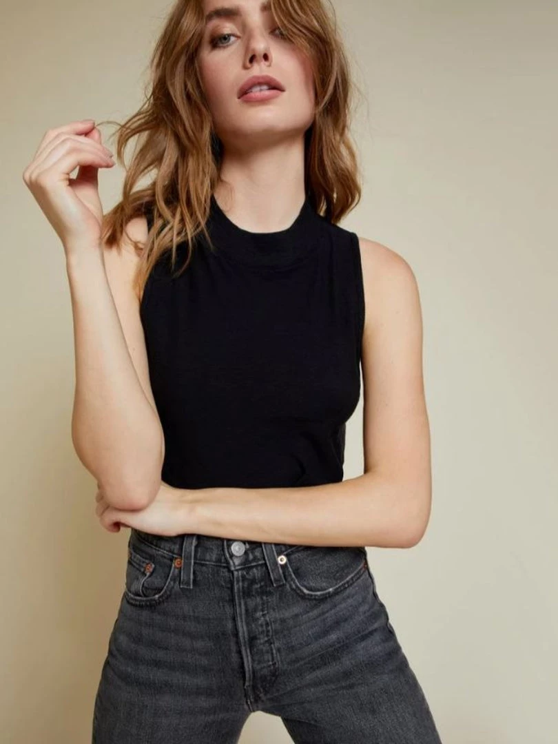 A flattering slim fit tank with a slight mock neck making it perfect for day or night. Layer it now and wear it alone later.