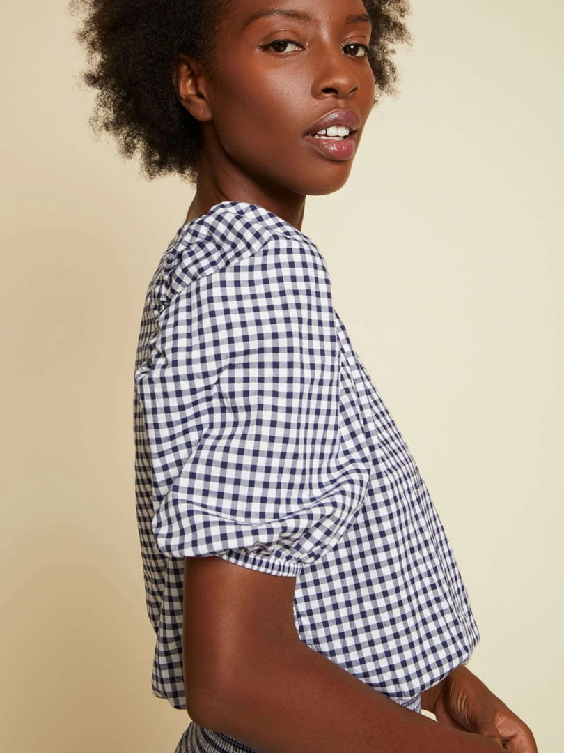 Cropped and cute in Stonewashed Cotton Poplin. This puff-sleeve top pairs perfectly with high-rise jeans. Elastic at hem. Back button closure.