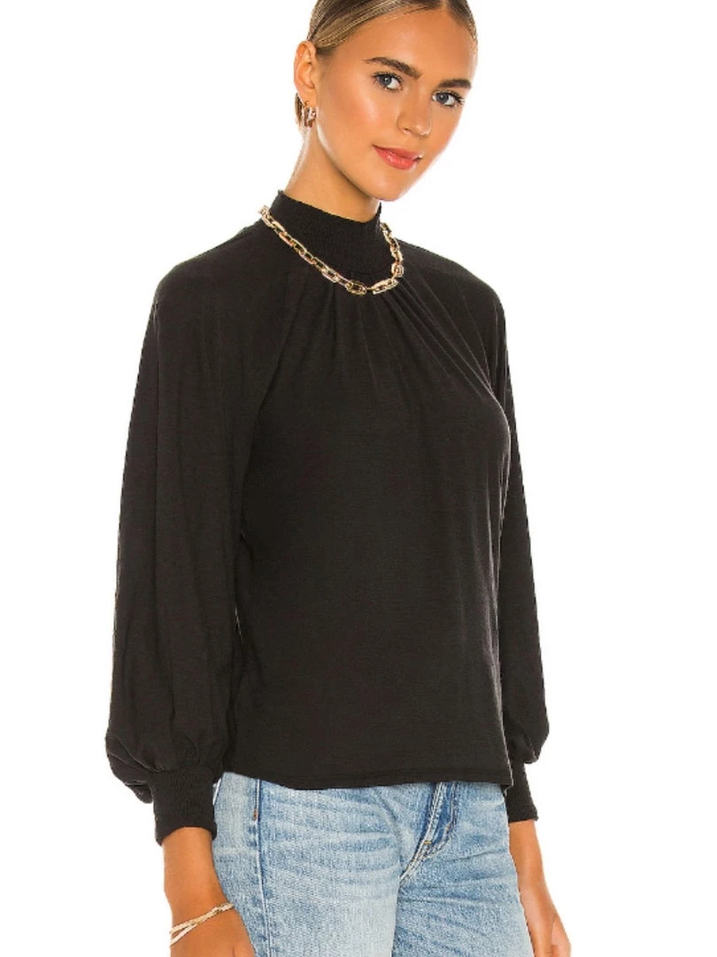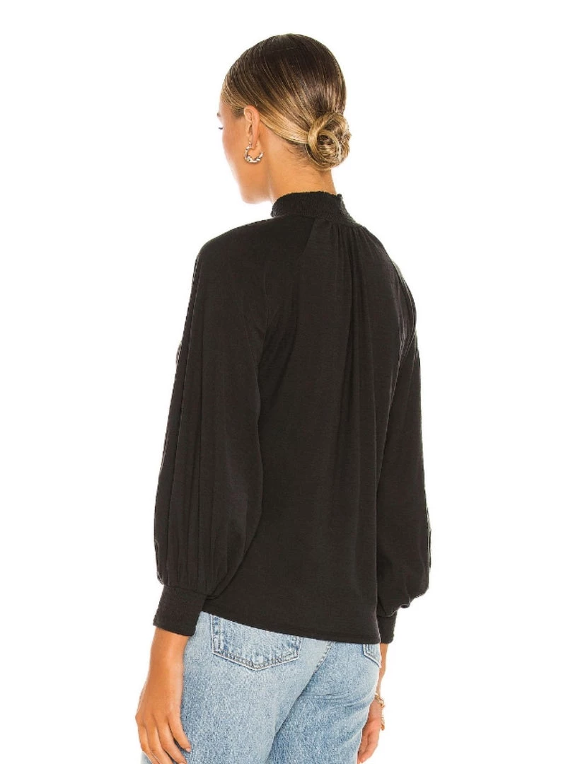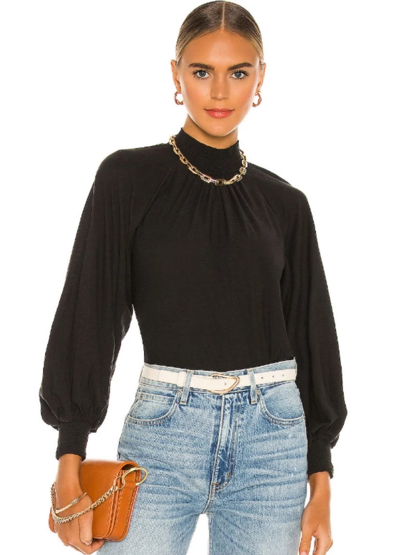 This peasant style tee with its high neck and tall smocked cuffs is the definition of 70s sexy. Bracelet length sleeves.