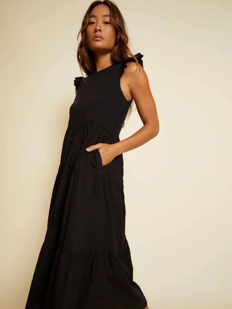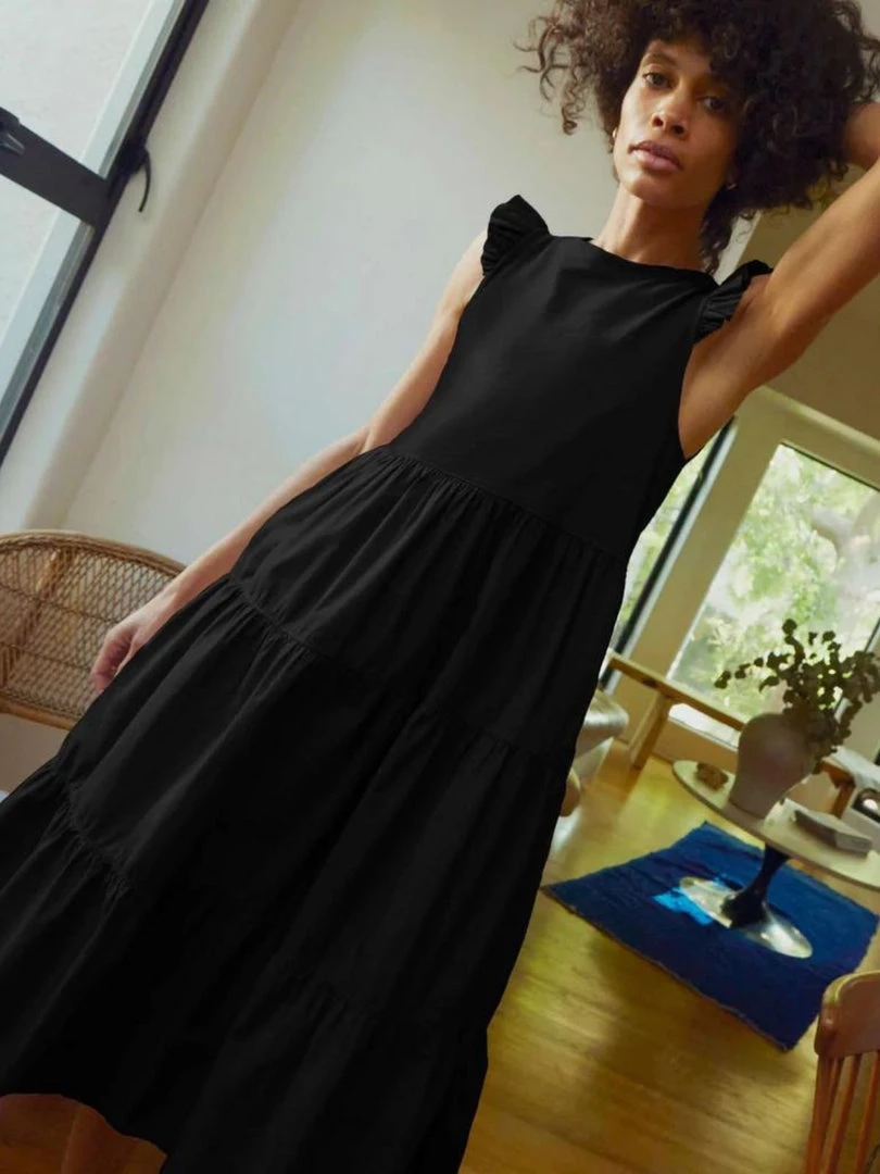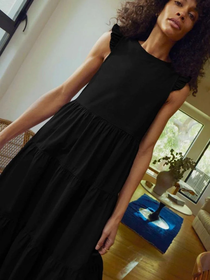 A ruffle sleeve tank dress with a Stonewashed Cotton Poplin tiered bottom. The definition of relaxed femininity. Midi length.