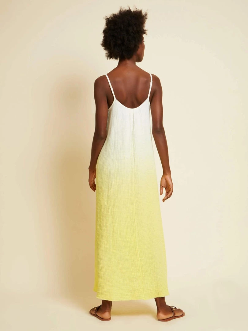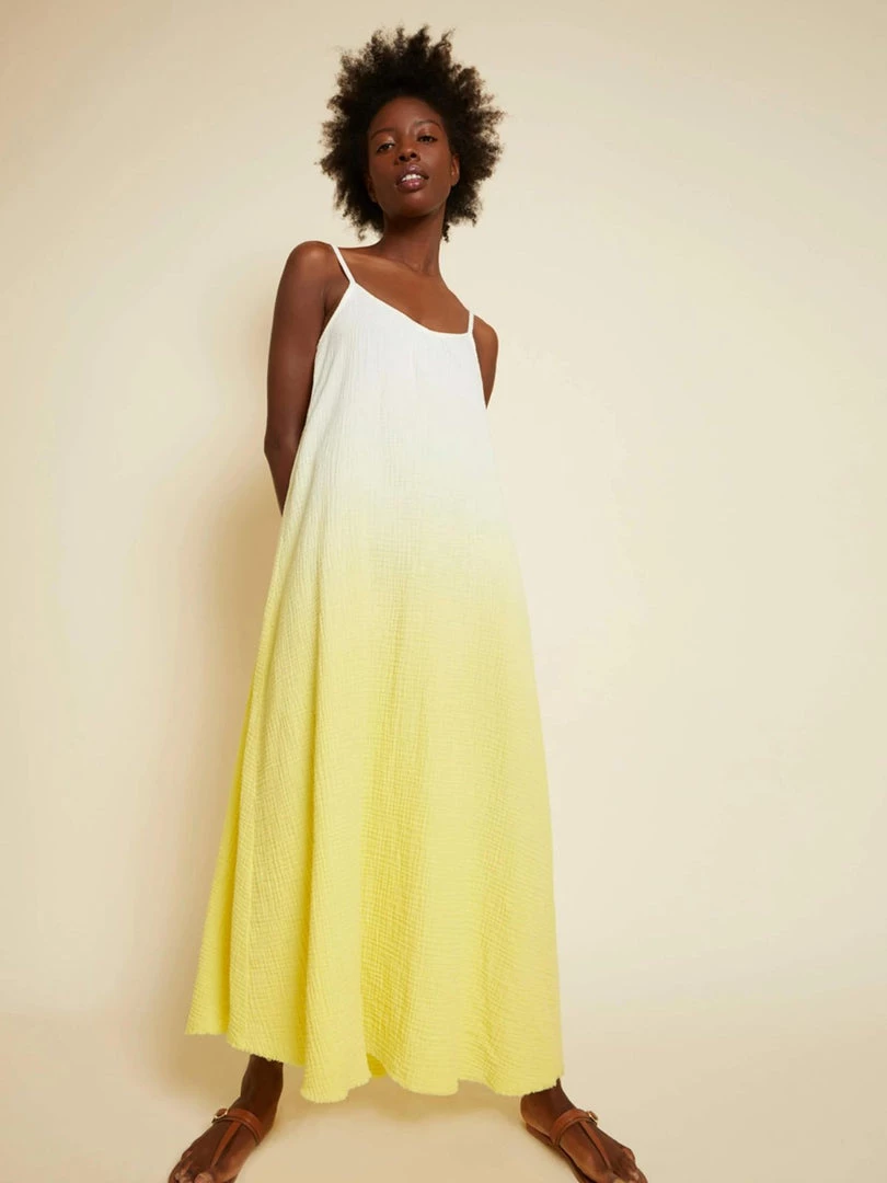 The oversized silhouette of the trapeze dress gets a modern update with a raw hem. It’s the Double Gauze dress that every girl wants to wear. This one comes in our hand dipped Ombre Butter tie-dye.