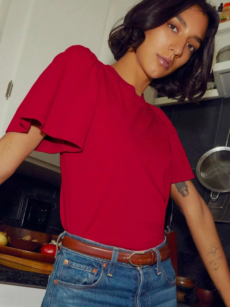 The playful flutter sleeves on this mock neck make it the one to wear when you want your outfit to do the flirting for you…
