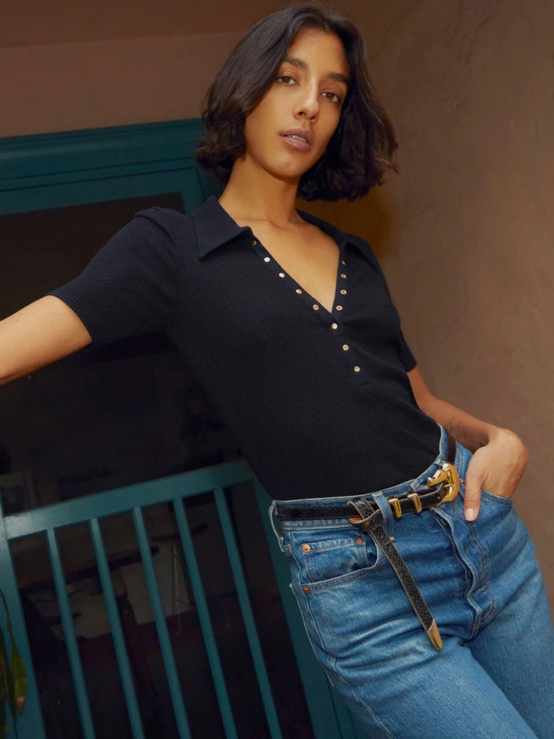A sexy take on the polo tee in Brushed Sweater Knit. Wear the signature gold cap snaps perfectly undone to give it some edge…