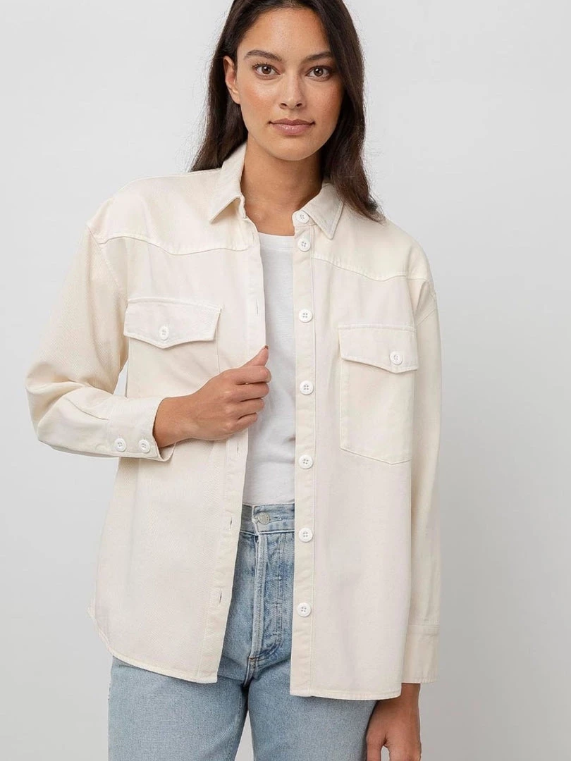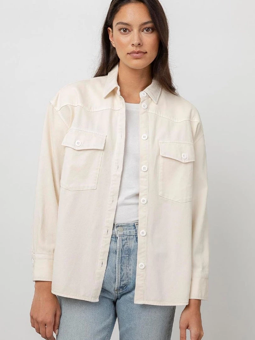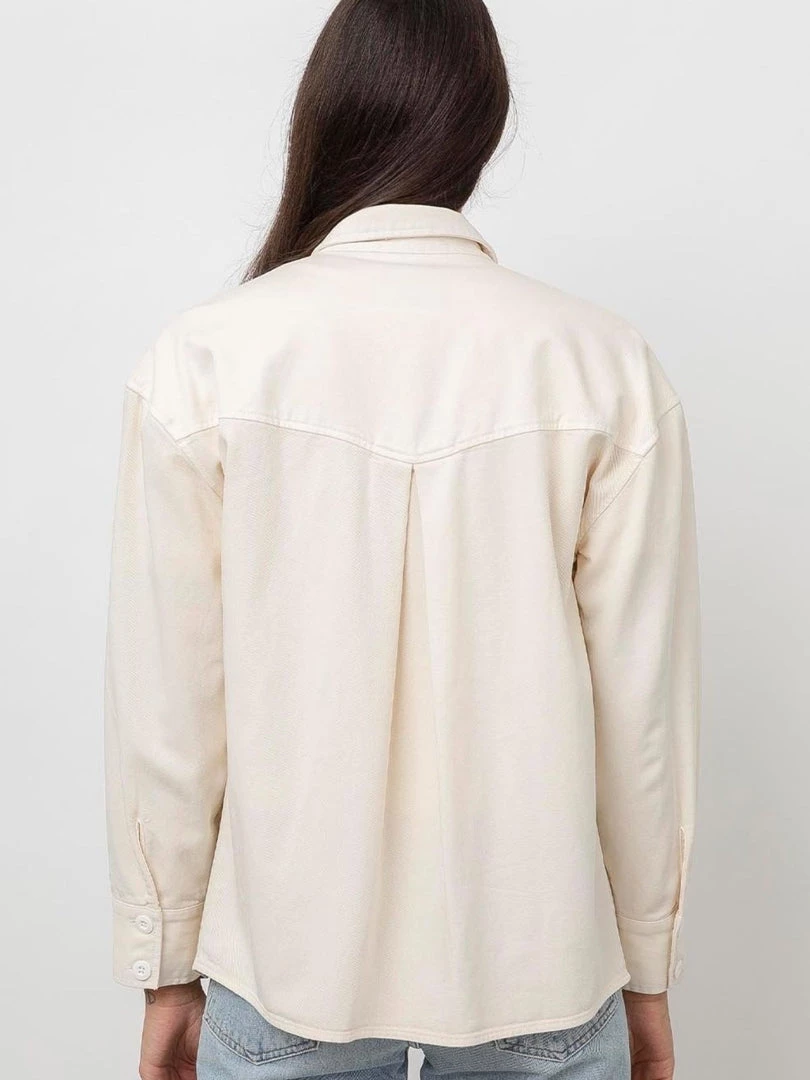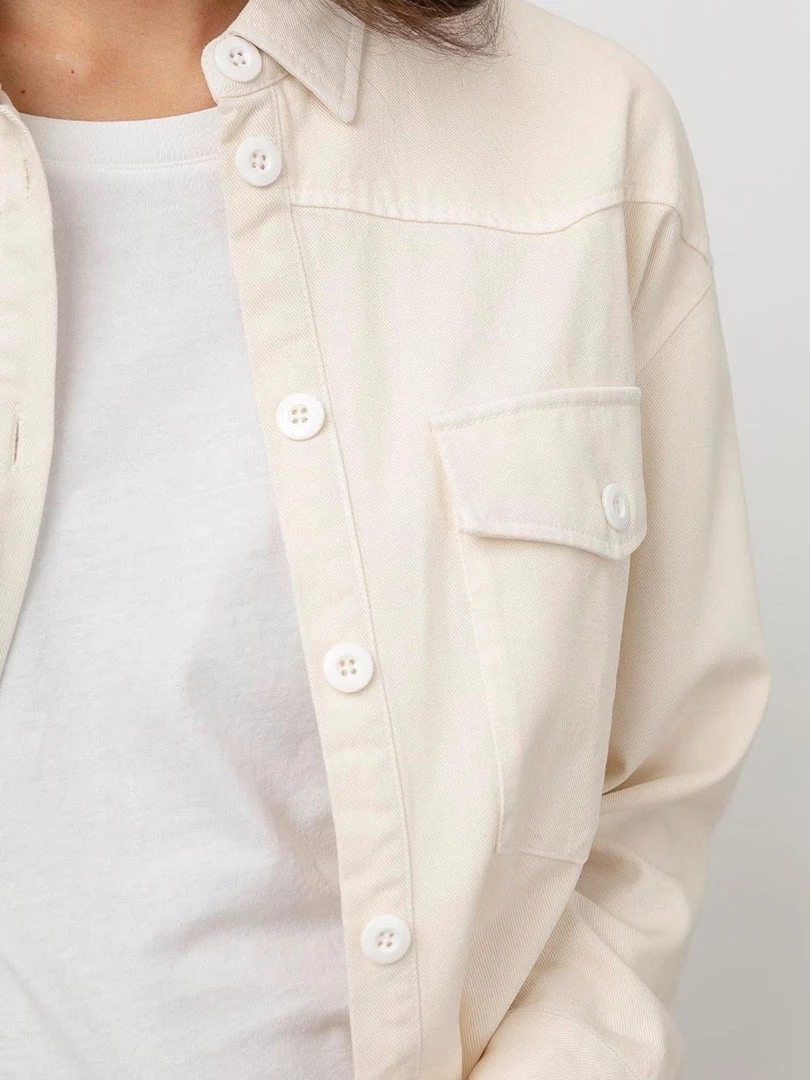 Heavyweight, structured twill denim, long sleeve, natural ivory collared buttondown shirt jacket featuring oversized fit, western yoke details, and oversized military patch pockets at chest. This classic throw-on-and-go style is perfect for transitional temps.