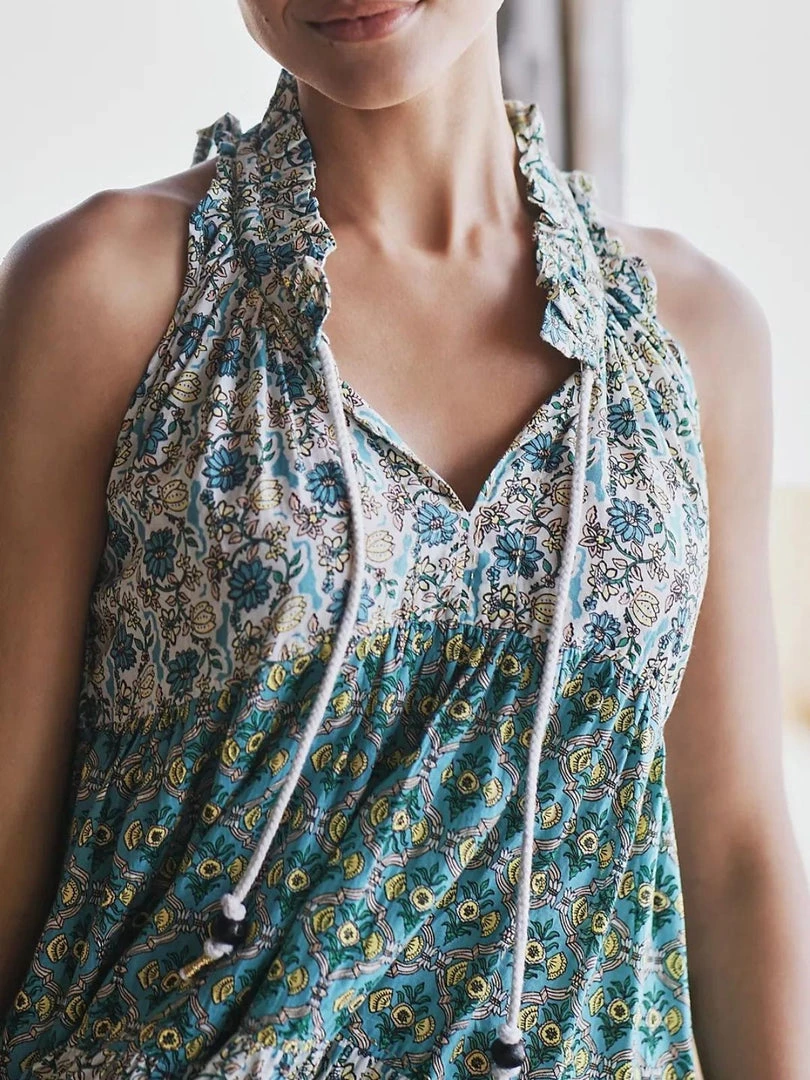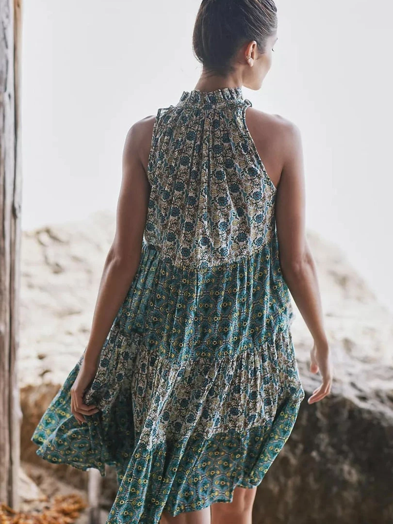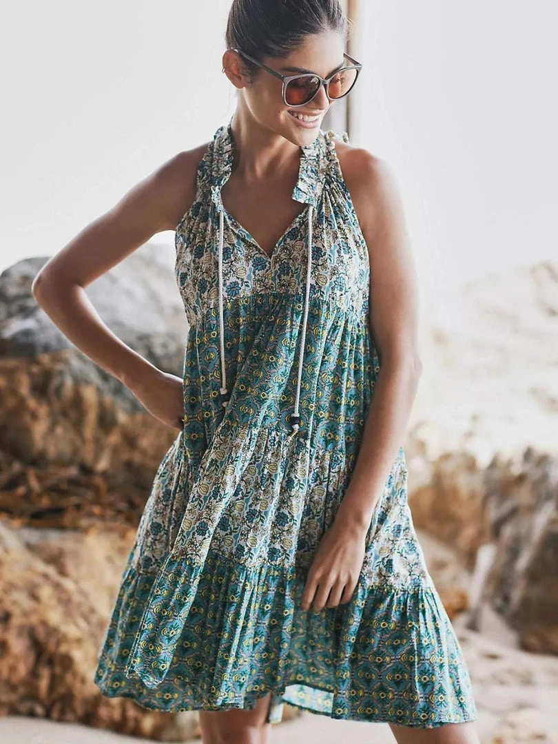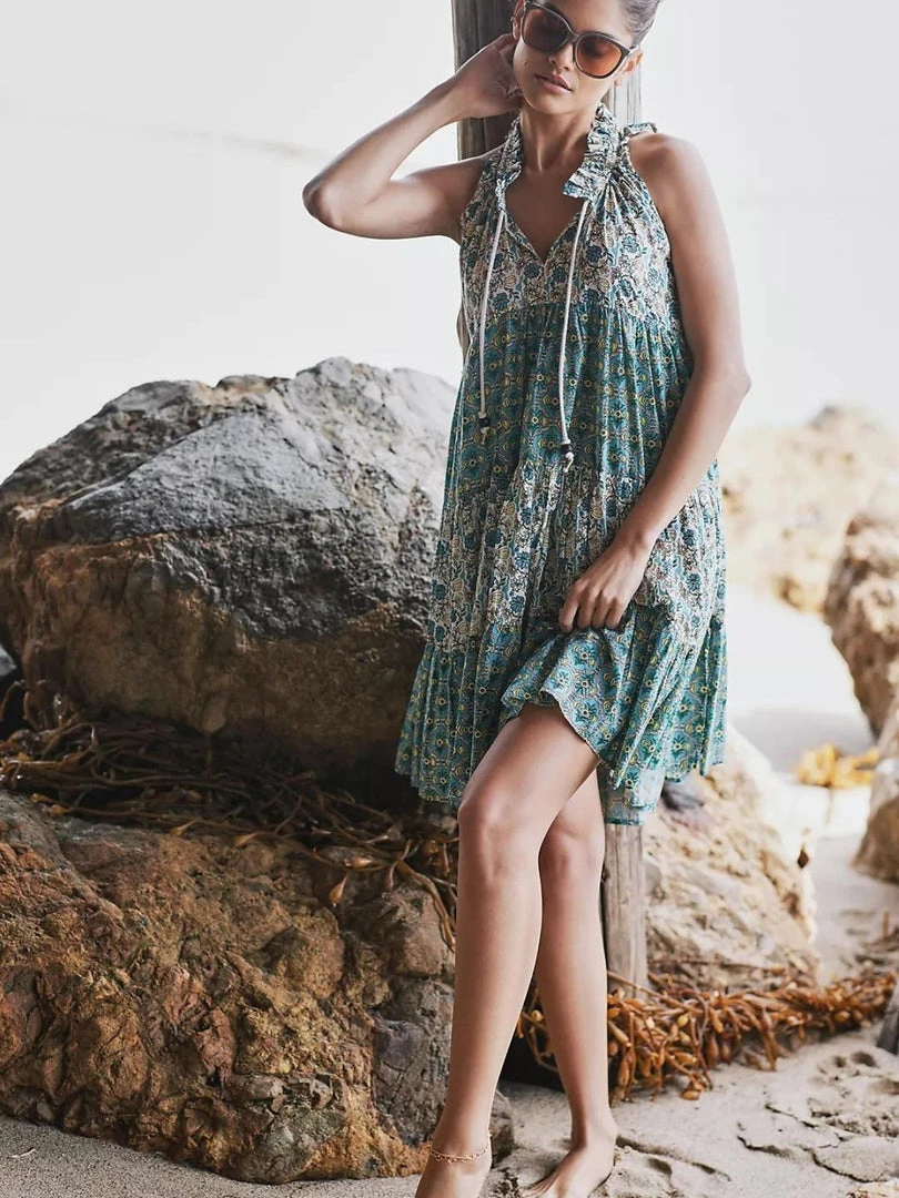 Sofia sleeveless short dress with v-neckline and draw cord closure, features tiered floral design and flounce hem.