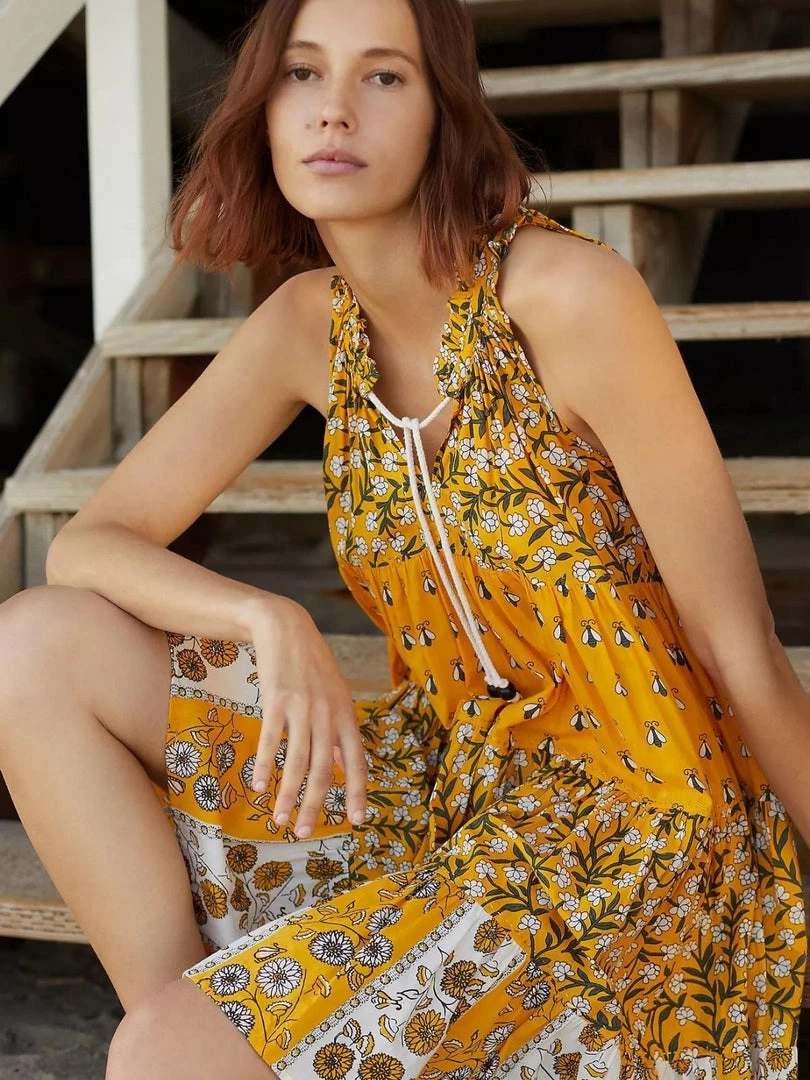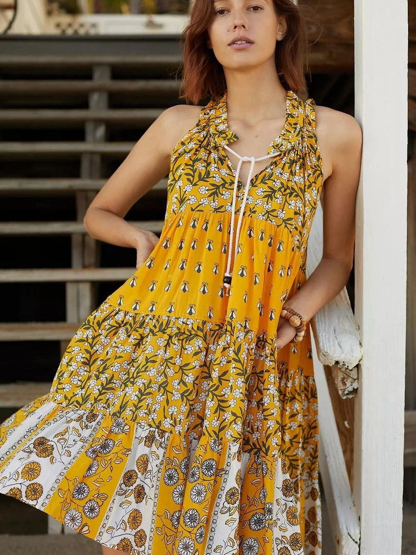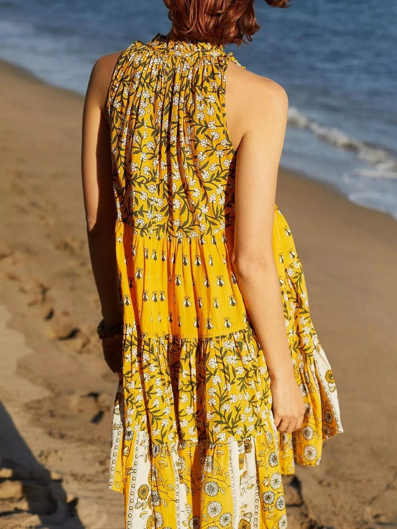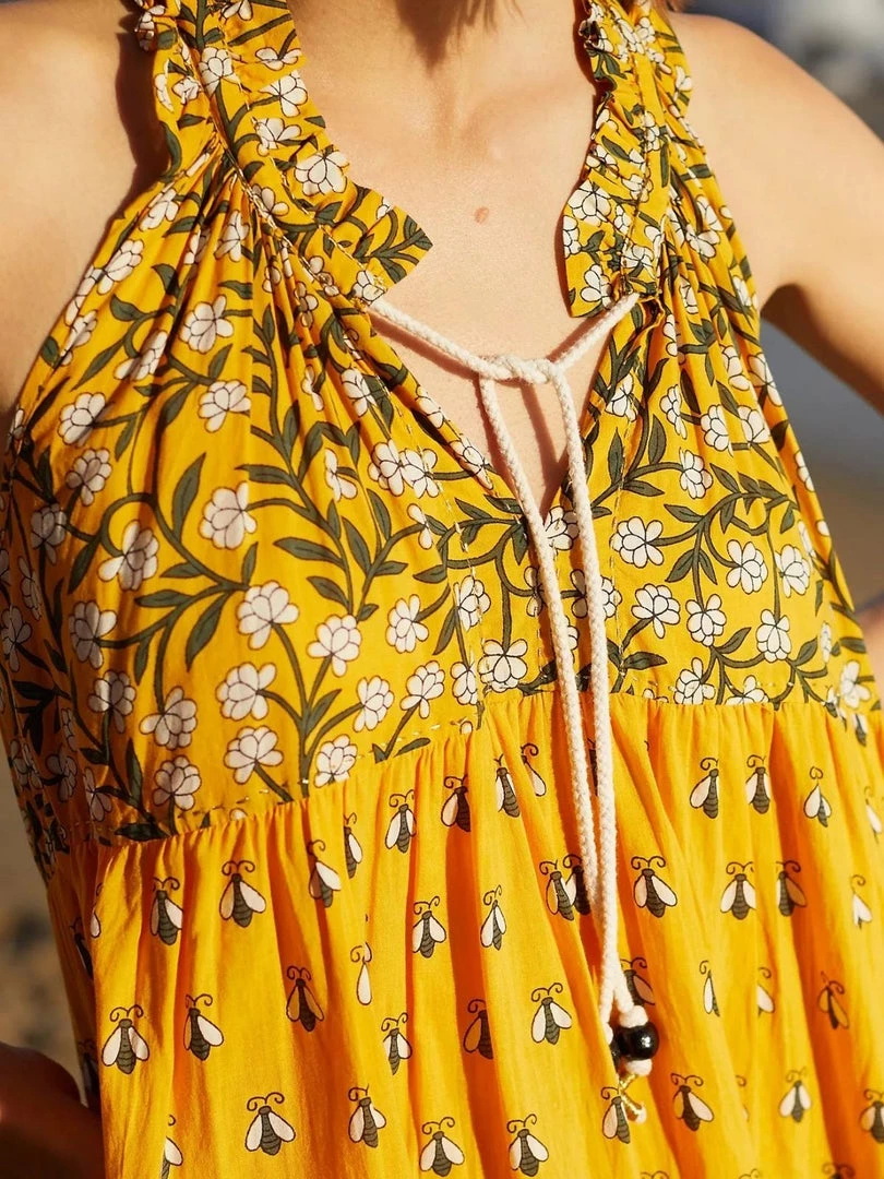 Sofia sleeveless short dress with v-neckline and draw cord closure, features tiered floral design and flounce hem.
