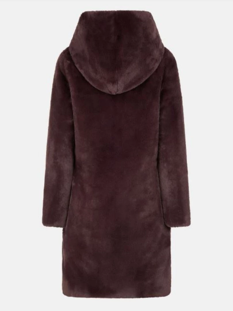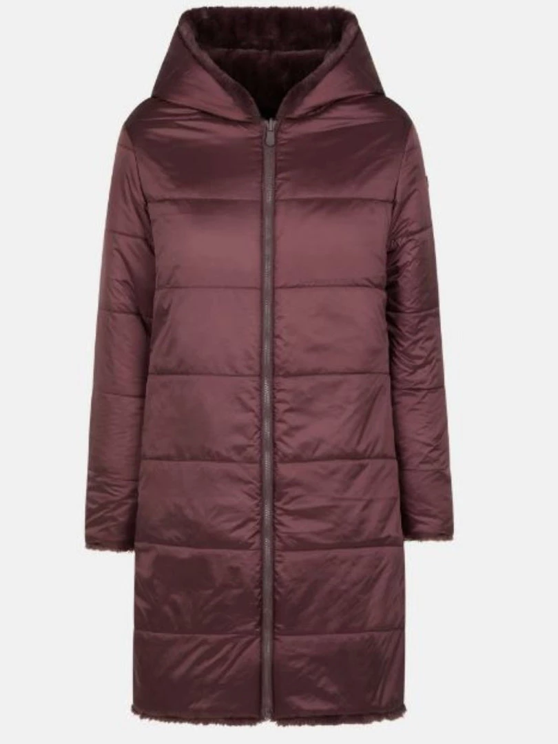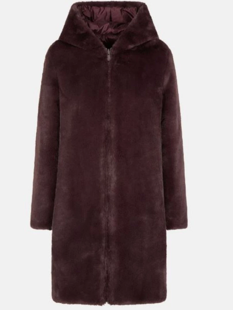 A long, reversible coat in mixed material of faux fur and 100% recycled polyester. The quilted side is made of IRIS fabric with an iridescent shine while the non-quilted side is made of 100% recycled polyester soft touch faux fur. Equipped with a hood, a central double slider zip and two side pockets with zips. The coat is finished with a tonal logo on the quilted side.
