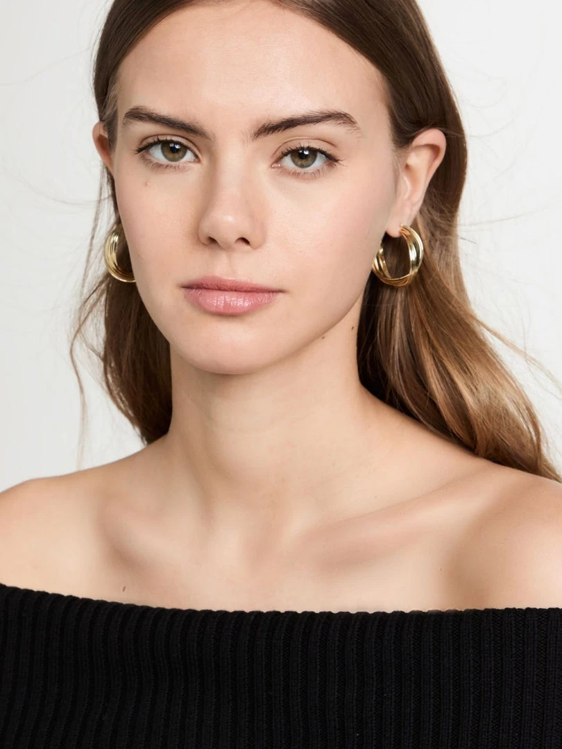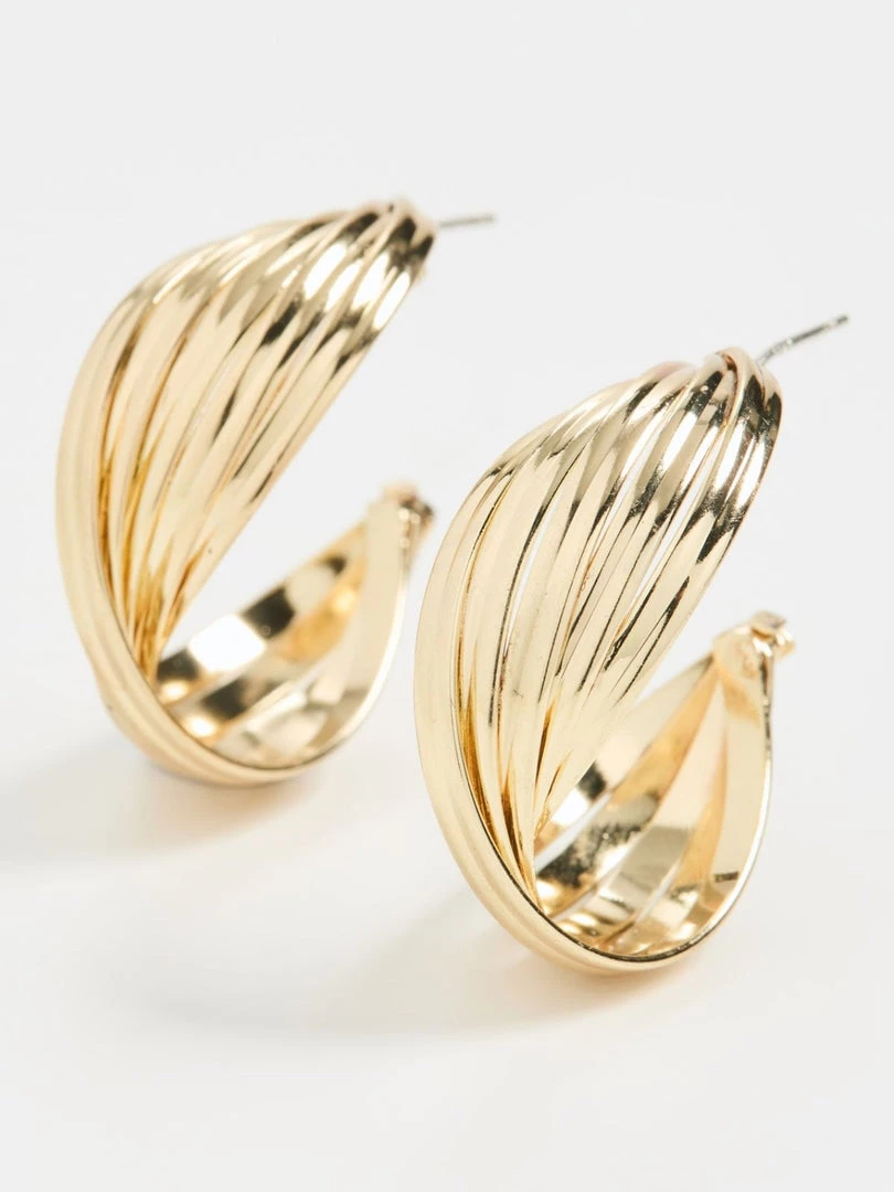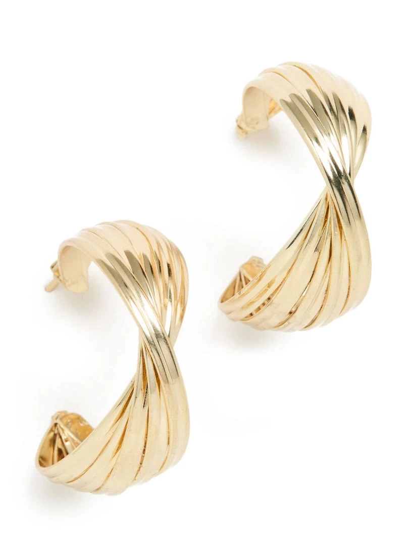 A pair of SHASHI hoop earrings in high-shine gold plate, featuring a twisted design for a touch of texture.