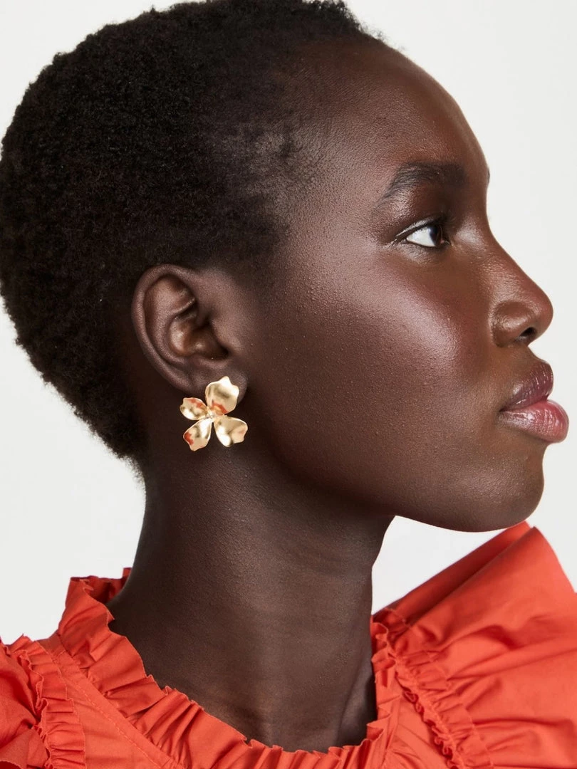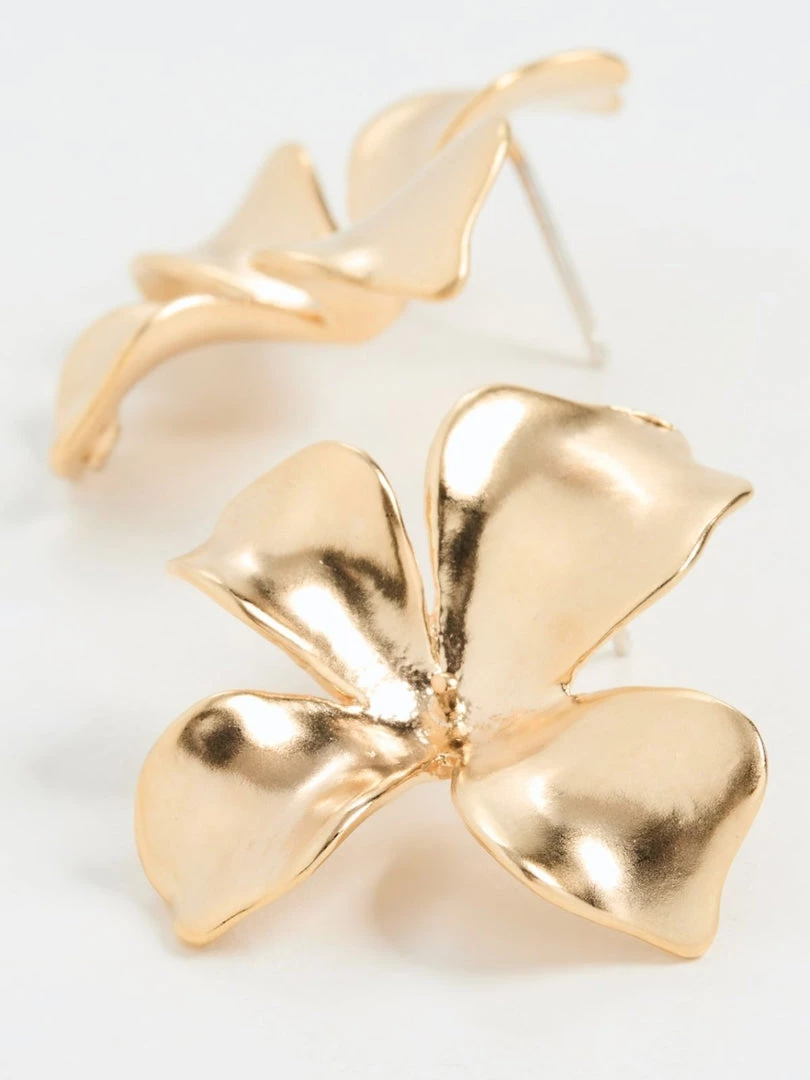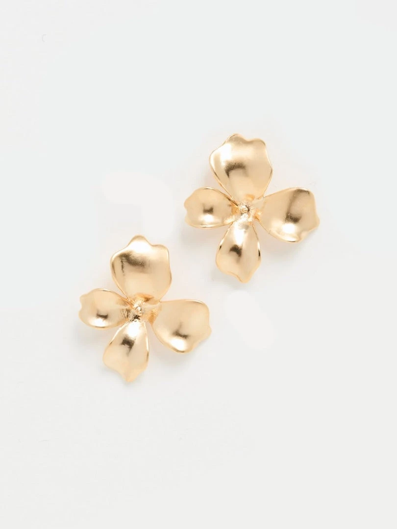 A pair of pretty SHASHI earrings with a gold-tone sheen, featuring a gently curing floral silhouette.