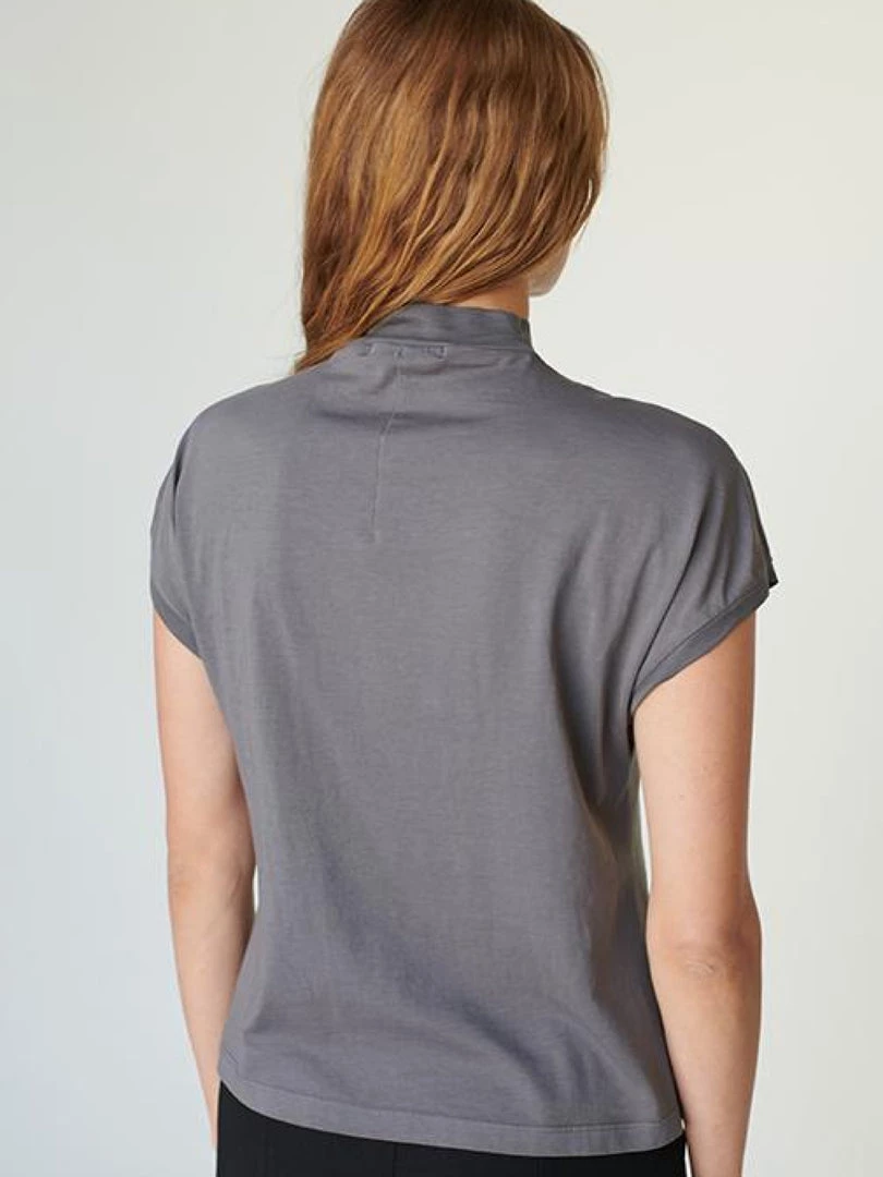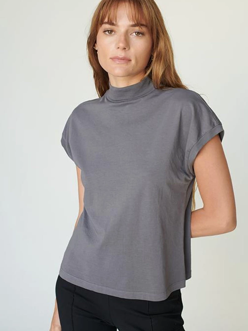 Add some newness to your T-shirt assortment. The short sleeve, mock neck dolman tee is a relaxed fit.