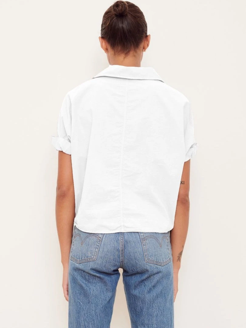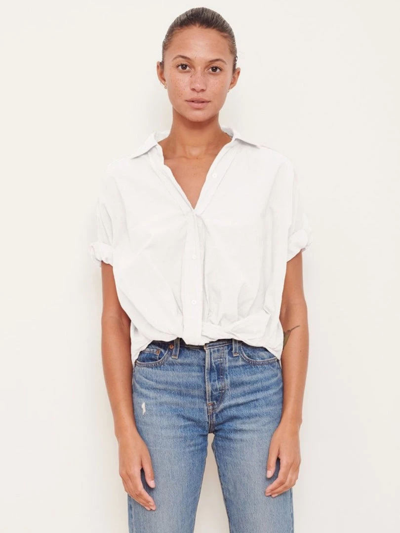Poplin short sleeve front twist button up shirt. Made from soft, washed poplin. A classic collared shirt with a twist. Made in the States.