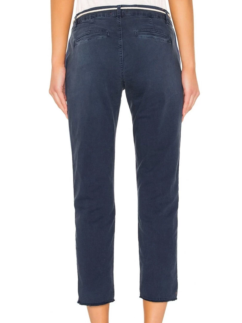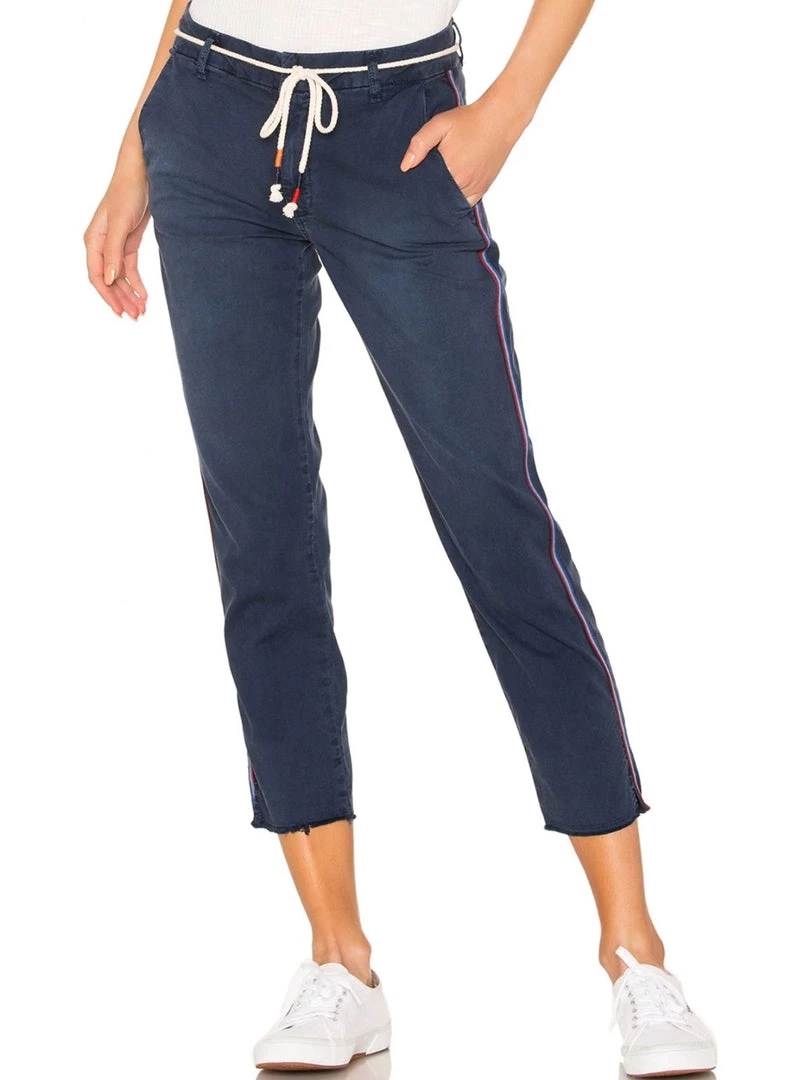 98% cotton, 2% spandex. Zip fly with hook and bar closure. Adjustable detachable waist tie belt. Side slant pockets. Side contrasted striping. Frayed hem. 16″ at the knee narrows to 10″ at the leg opening. Made in USA.