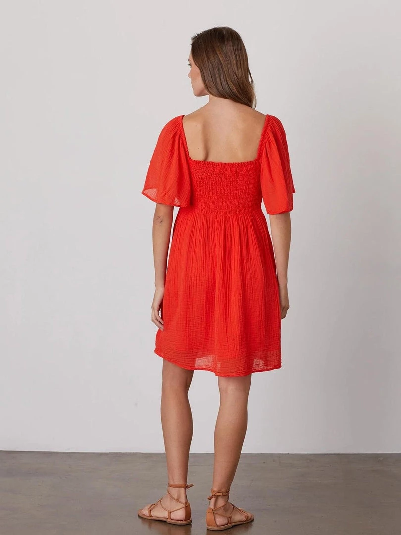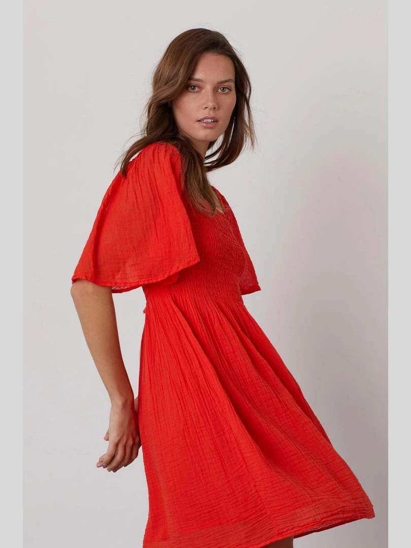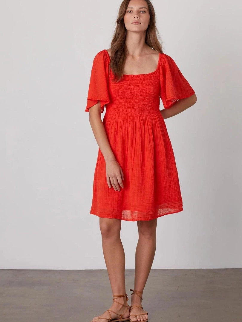 We’re ready for the heat in this reworked version of a classic peasant dress. Featuring a smocked torso and a flowy tulip sleeve that can be worn on or off the shoulders. Pop on and go.