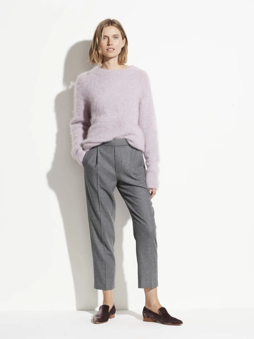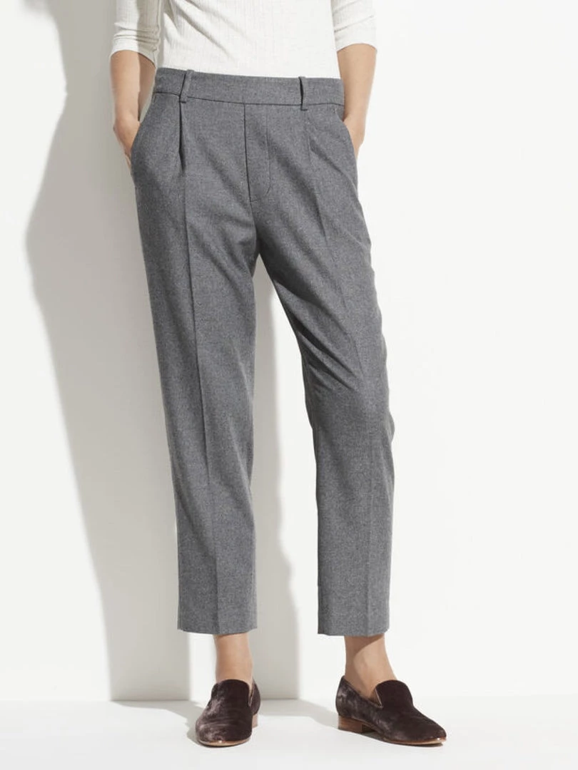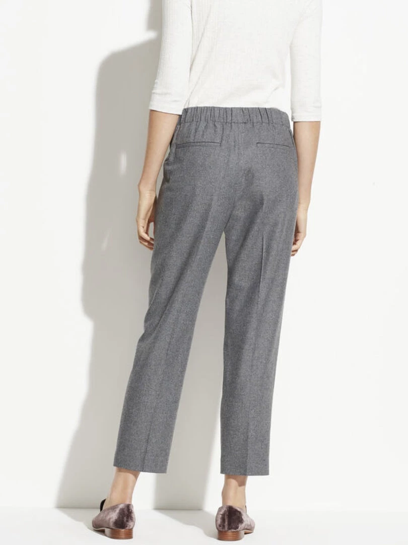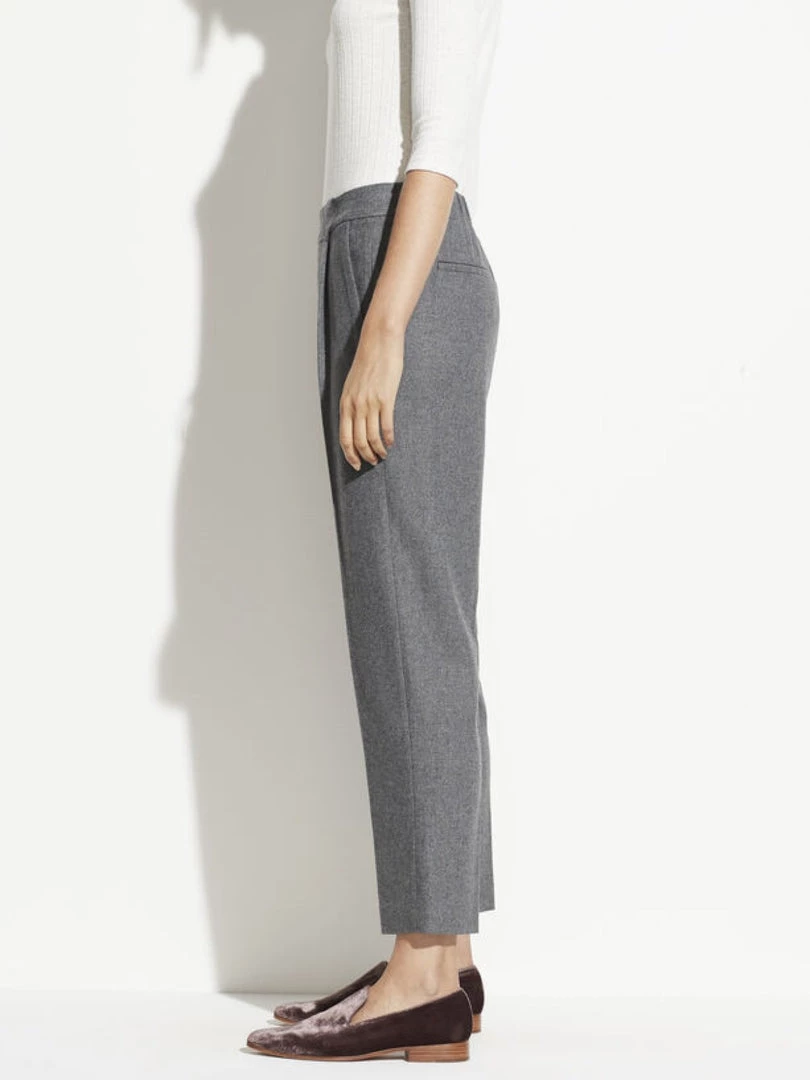 Cut from an Italian wool suiting fabric, these elevated pull on pants are effortlessly polished with a faux fly detail and pleated, cropped leg.