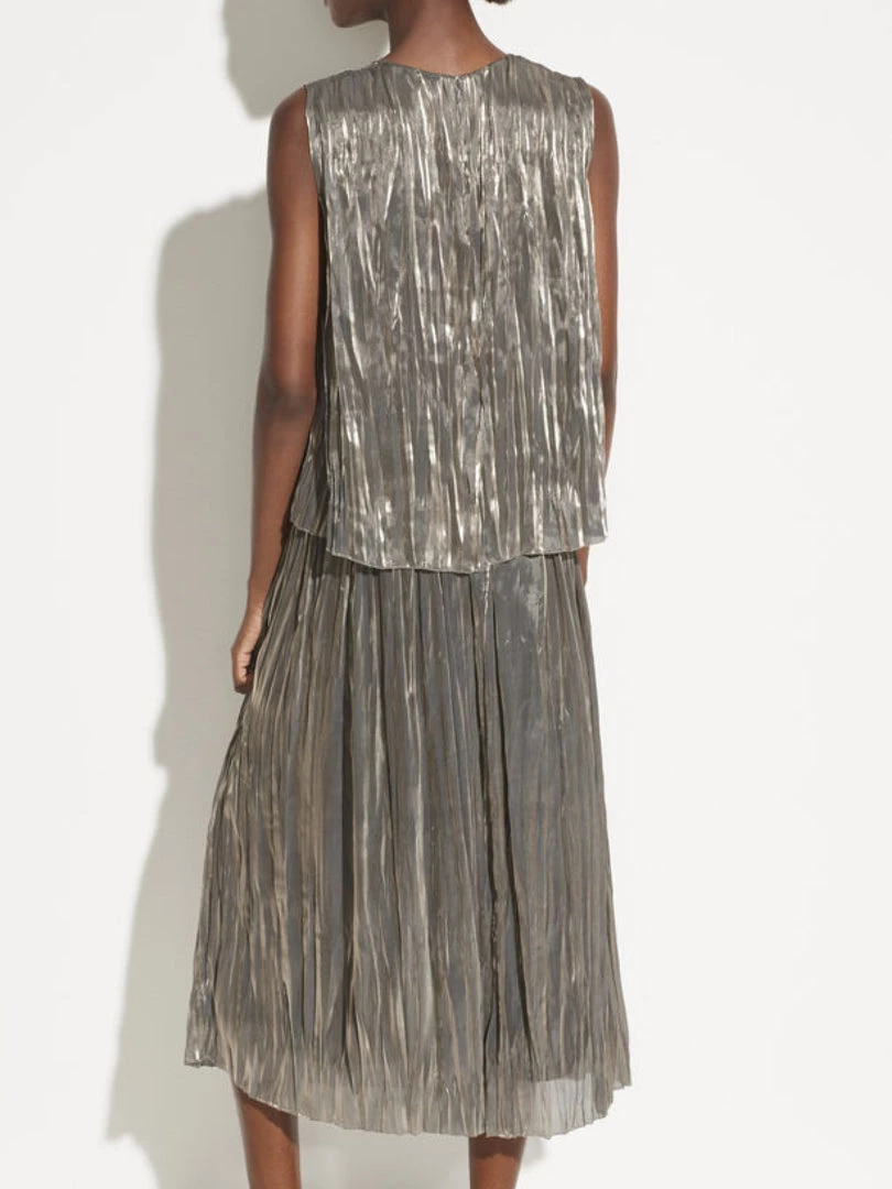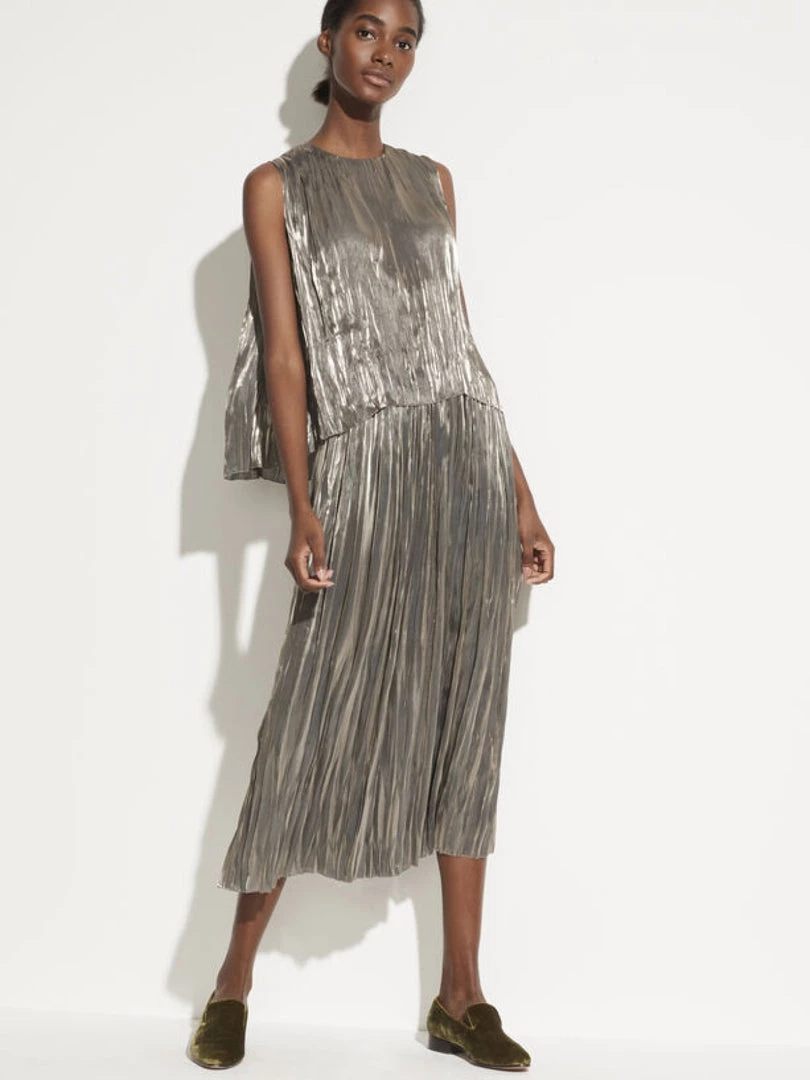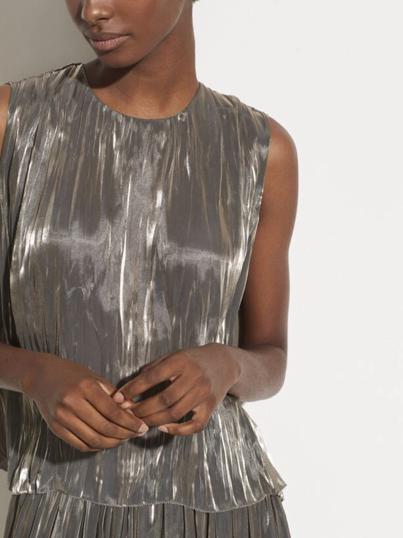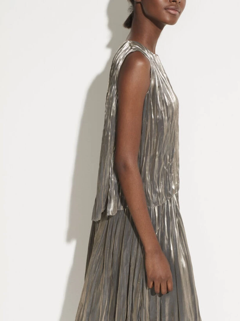 A special style in pleated iridescent fabric. With a crew neckline, this sleeveless shell features an asymmetric hem that’s slightly longer at the back. Pair with the matching culotte for the full look.