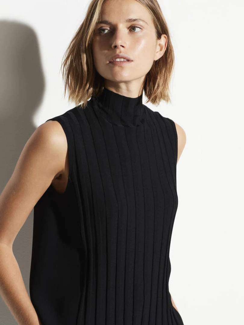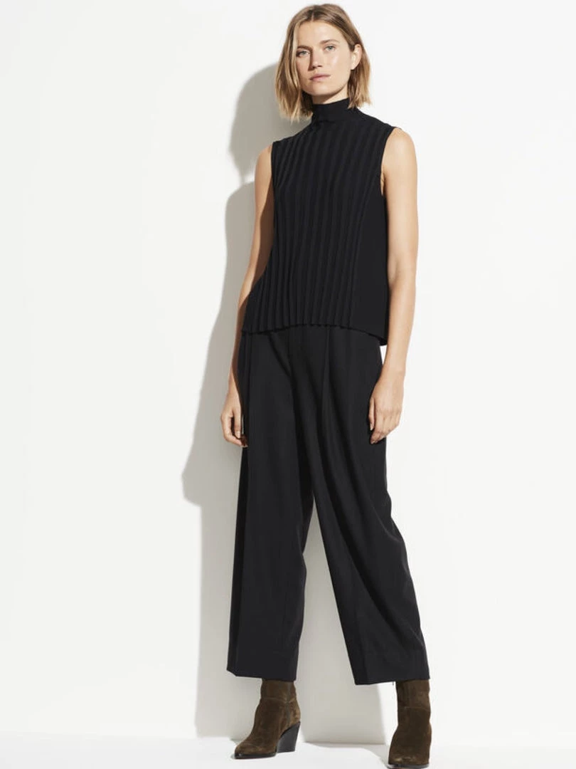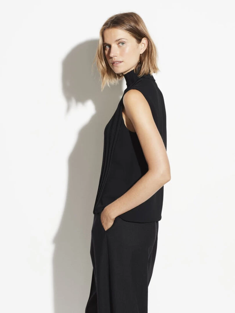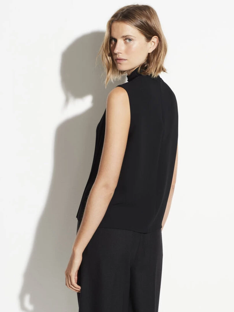 This sleeveless crepe blouse features a turtleneck and ribbed front panel.