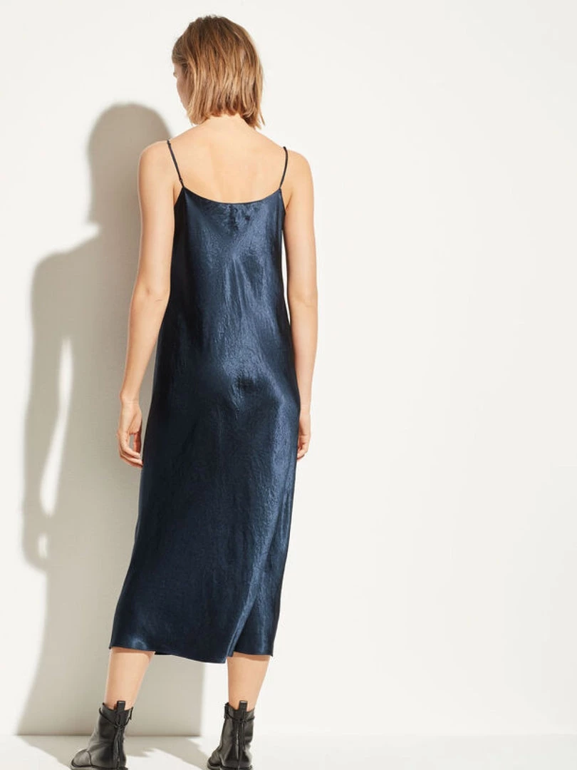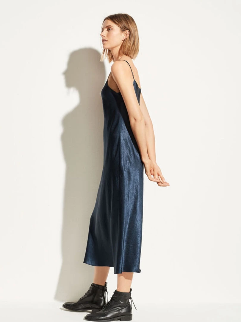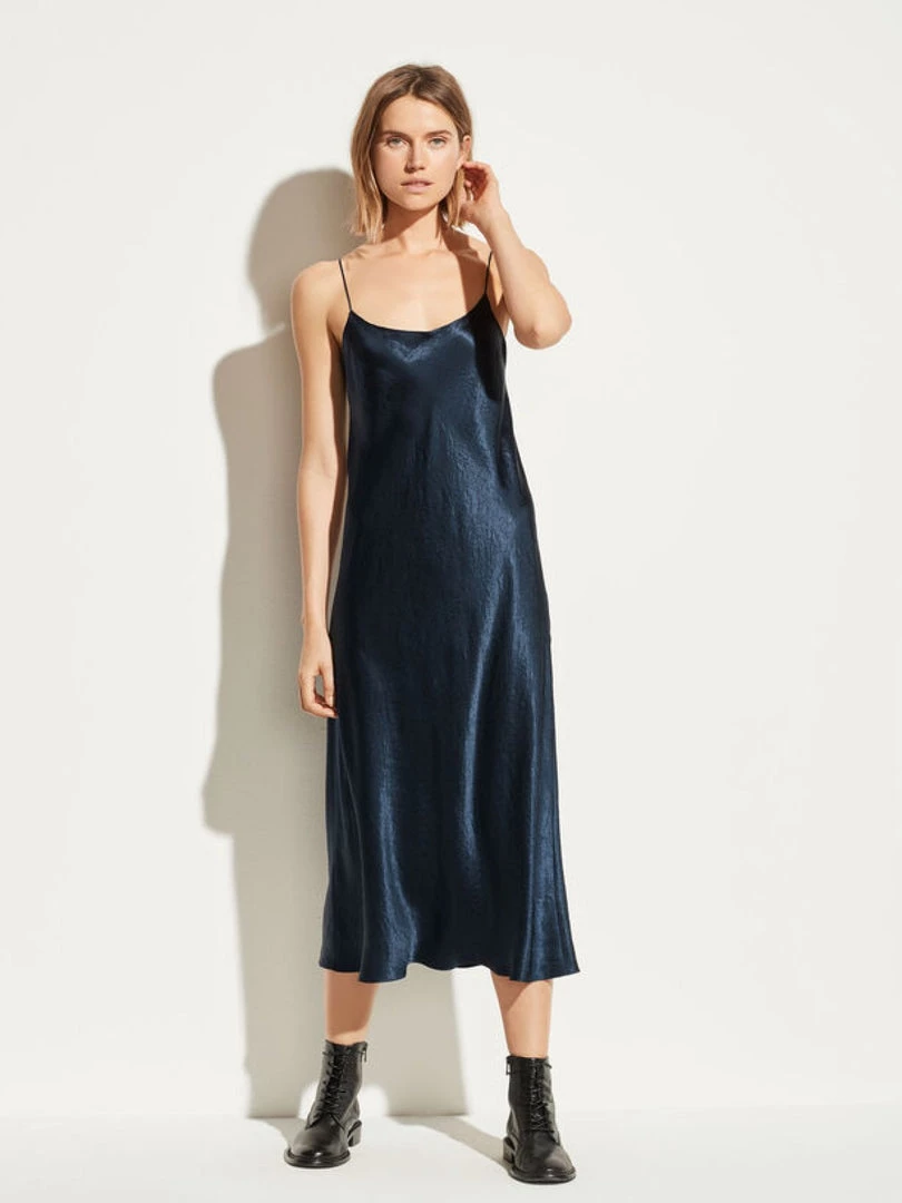 A modern slip dress cut from lustrous Japanese satin. Wear it with flats for effortless elegance.